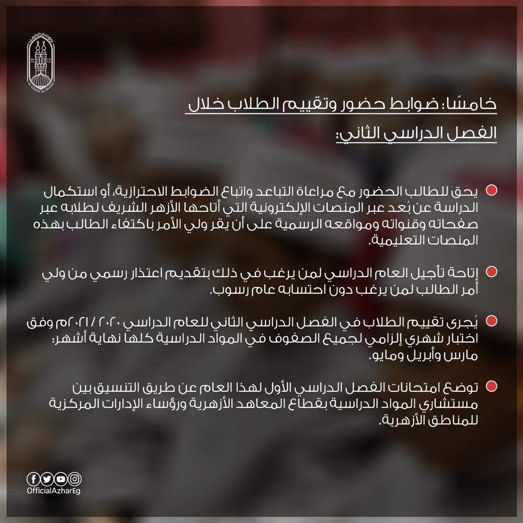 1- يحق للطالب الحضور مع مراعاة التباعد واتباع الضوابط الاحترازية، أو استكمال الدراسة عن بُعد عبر المنصات الإلكترونية التي أتاحها الأزهر الشريف لطلابه عبر صفحاته وقنواته ومواقعه الرسمية على أن يقر ولي الأمر باكتفاء الطالب بهذه المنصات التعليمية.