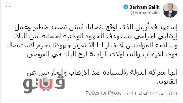 قال الرئيس العراقي، برهم صالح، في أول تعليق له على سقوط جرحى بعد إطلاق عدد من الصواريخ على مدينة أربيل وضواحيها: استهداف أربيل الذي أوقع ضحايا، يُمثل تصعيدًا خطيرًا.