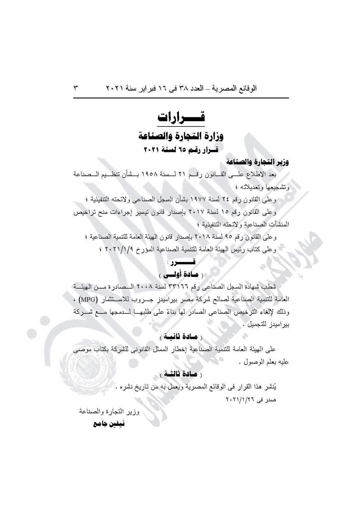 والقرار رقم 65 لسنة 2021، بشطب شهادة السجل الصناعي رقم 33166 لسنة 2008، الصادرة من الهيئة العامة للتنمية الصناعية لصالح شركة مصر بيراميدز جروب للاستثمار (MPG)، وذلك لإلغاء الترخيص الصناعي الصادر لها بناء على طلبها لدمجها مع شركة بيراميدز للتجميل.