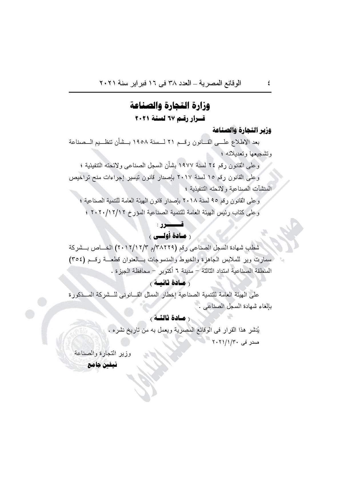 والقرار رقم 67 لسنة 2021، بشأن شطب شهادة السجل الصناعي رقم (38229/م 3/12/2012) الخاص بشركة سمارت وير للملابس الجاهزة والخيوط والمنسوجات بالعنوان قطعة رقم (354) المنطقة الصناعية امتداد الثالثة، مدينة 6 أكتوبر محافظة الجيزة.