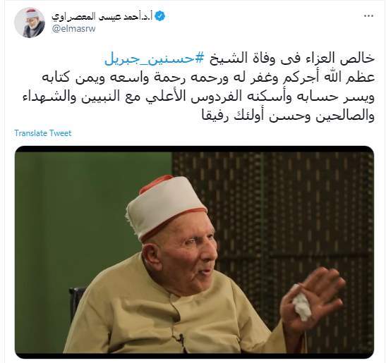 وكتب أحمد عيسى المعصراوي تغريدة علي تويتر "خالص العزاء فى وفاة الشيخ #حسنين_جبريل عظم الله أجركم وغفر له ورحمه رحمة واسعه ويمن كتابه ويسر حسابه وأسكنه الفردوس الأعلي مع النبيين والشهداء والصالحين وحسن أولئك رفيقا"