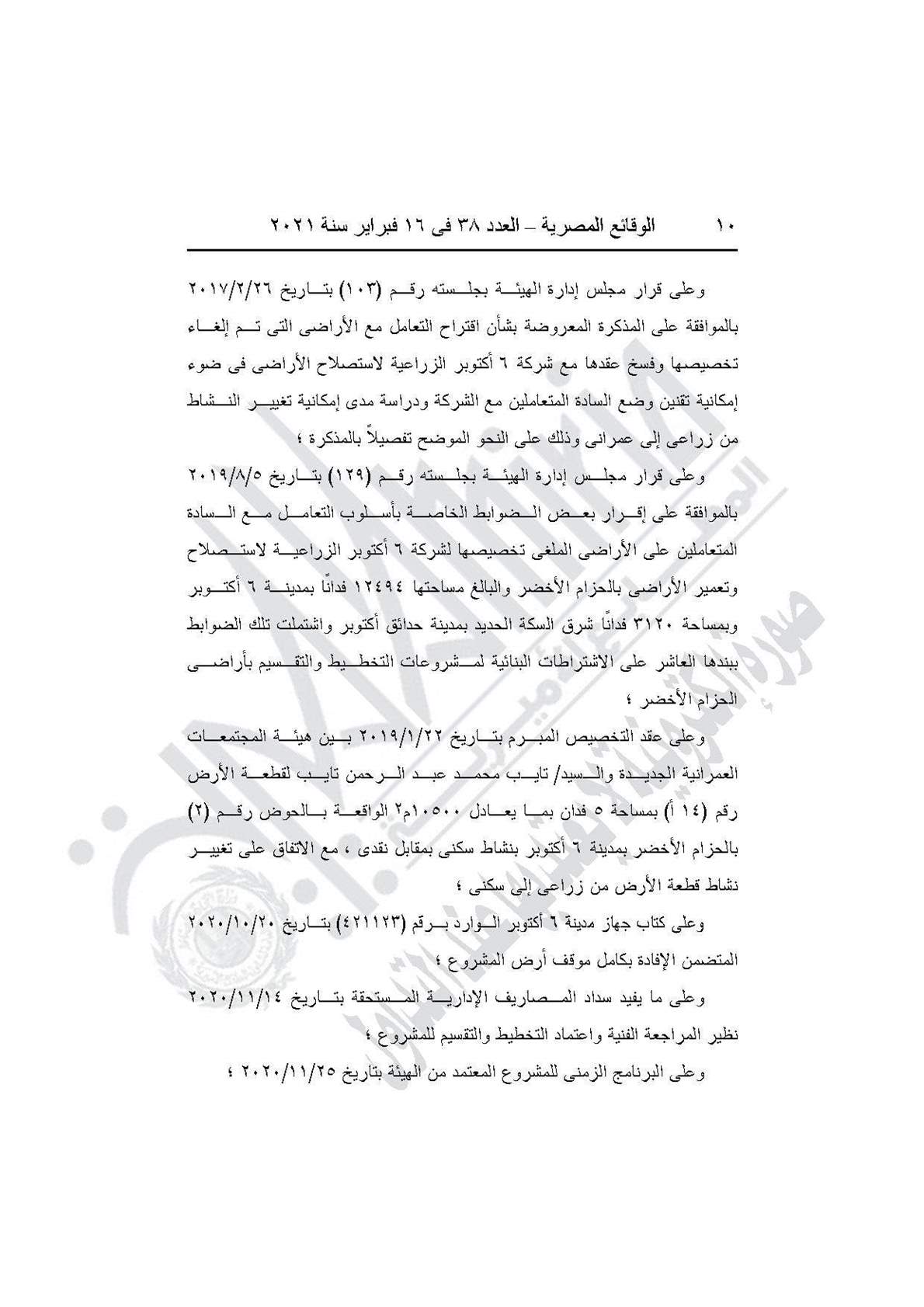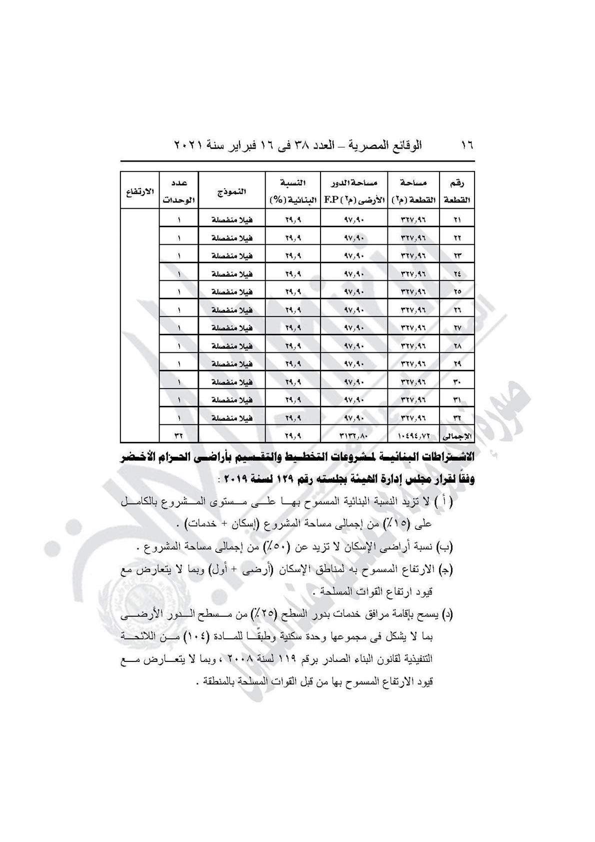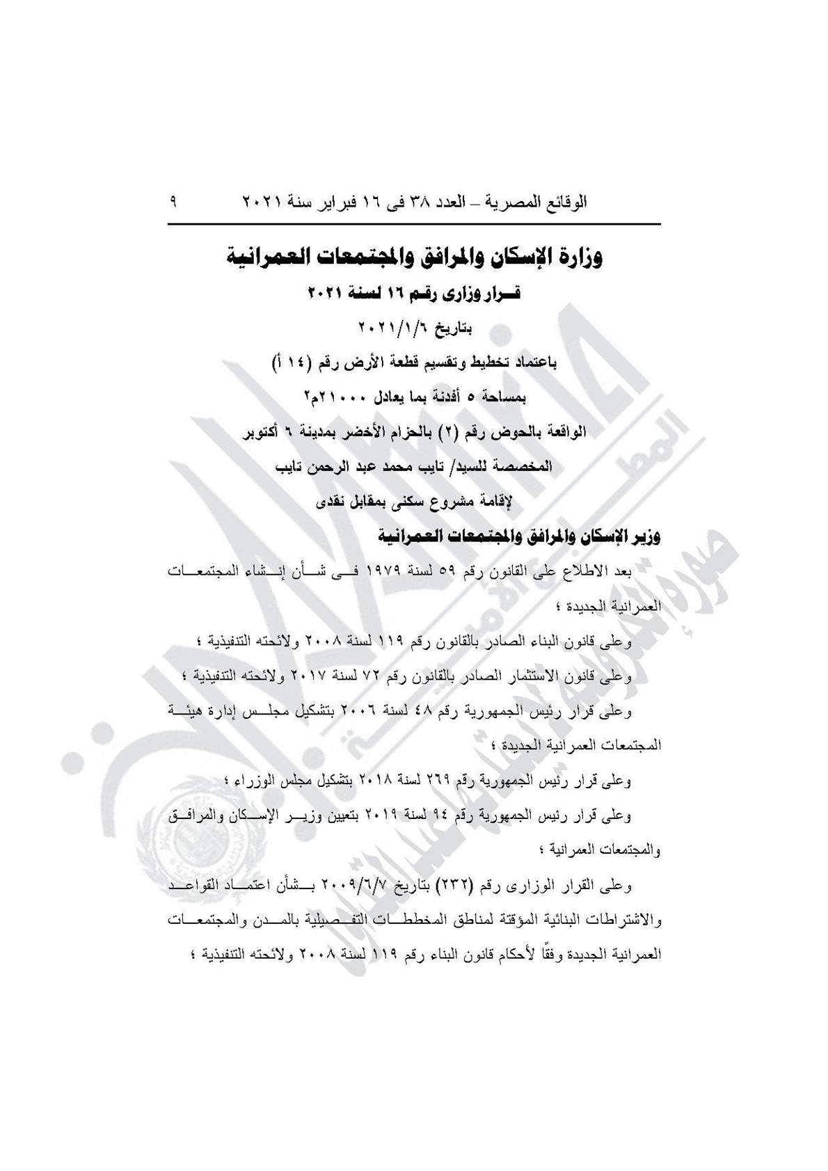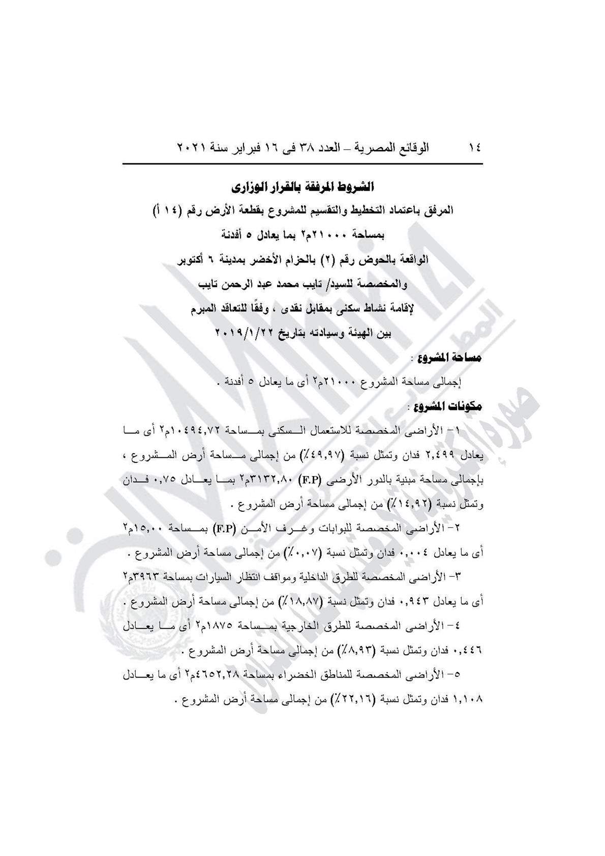 وينص القرار على اعتماد تخطيط وتقسيم قطعة الأرض رقم (14 أ) بمساحة 5 أفدنة بما يعادل 21000م2تر مربع، الواقعة بالحوض رقم (2) بالحزام الأخضر بمدينة 6 أكتوبر، والمخصصة لـ تايب محمد عبد الرحمن تايب؛ لإقامة مشروع سكنى بمقابل نقدى، وذلك طبقًا للحدود الموضحة على الخريطة المرفقة بهذا القرار والعقد المبرم بتاريخ 22/1/2019 والتى تعتبر جميعها مكملة لهذا القرار.