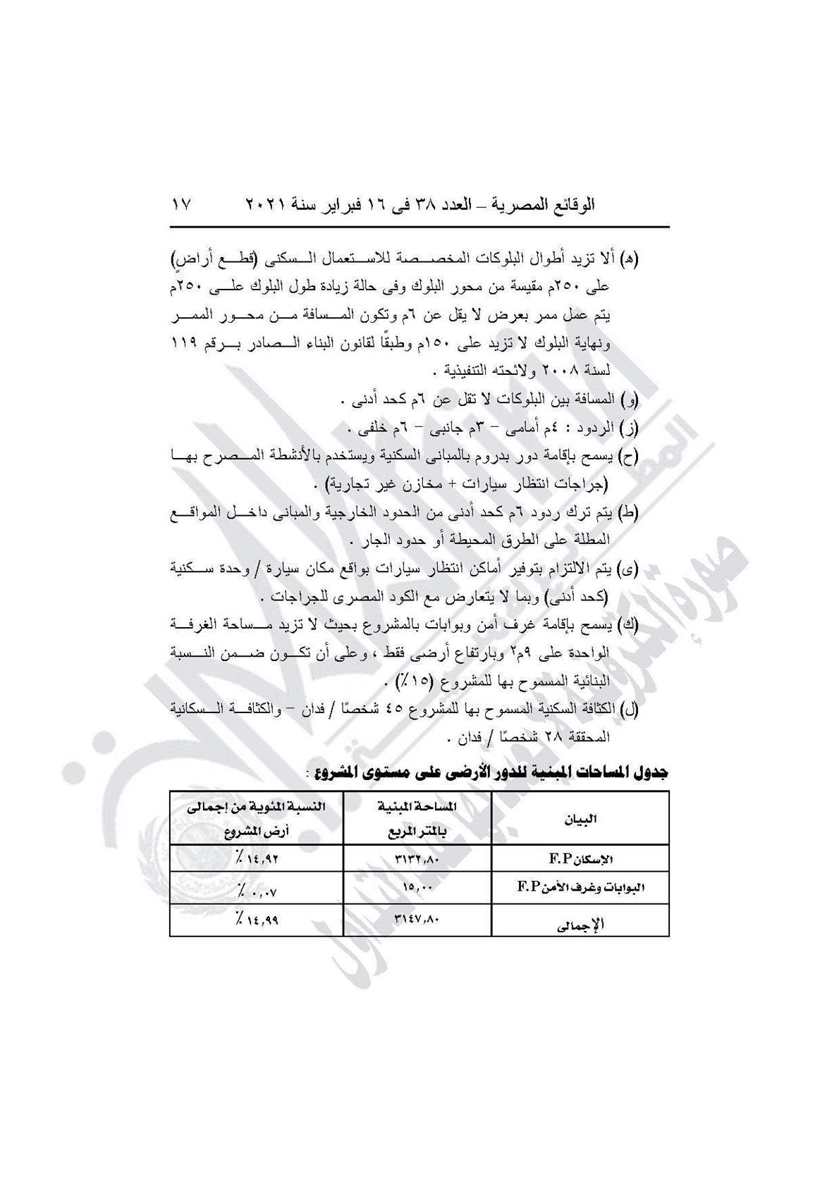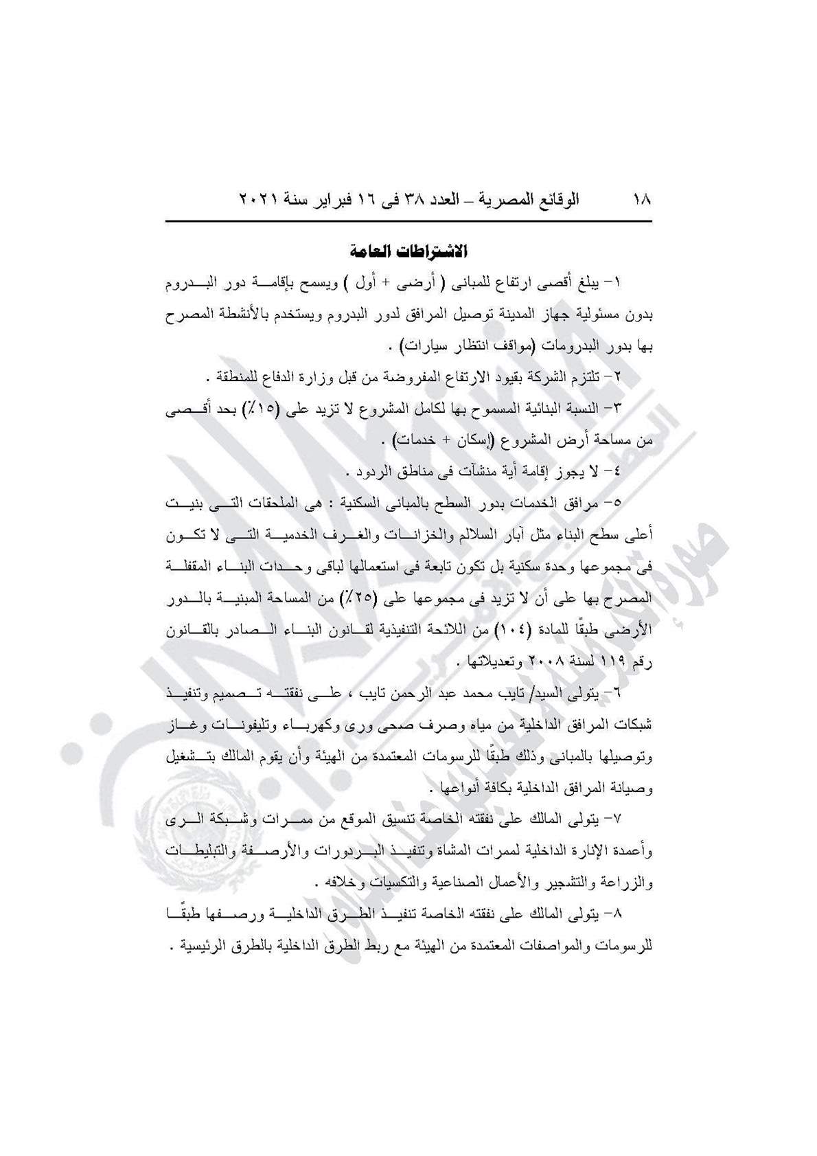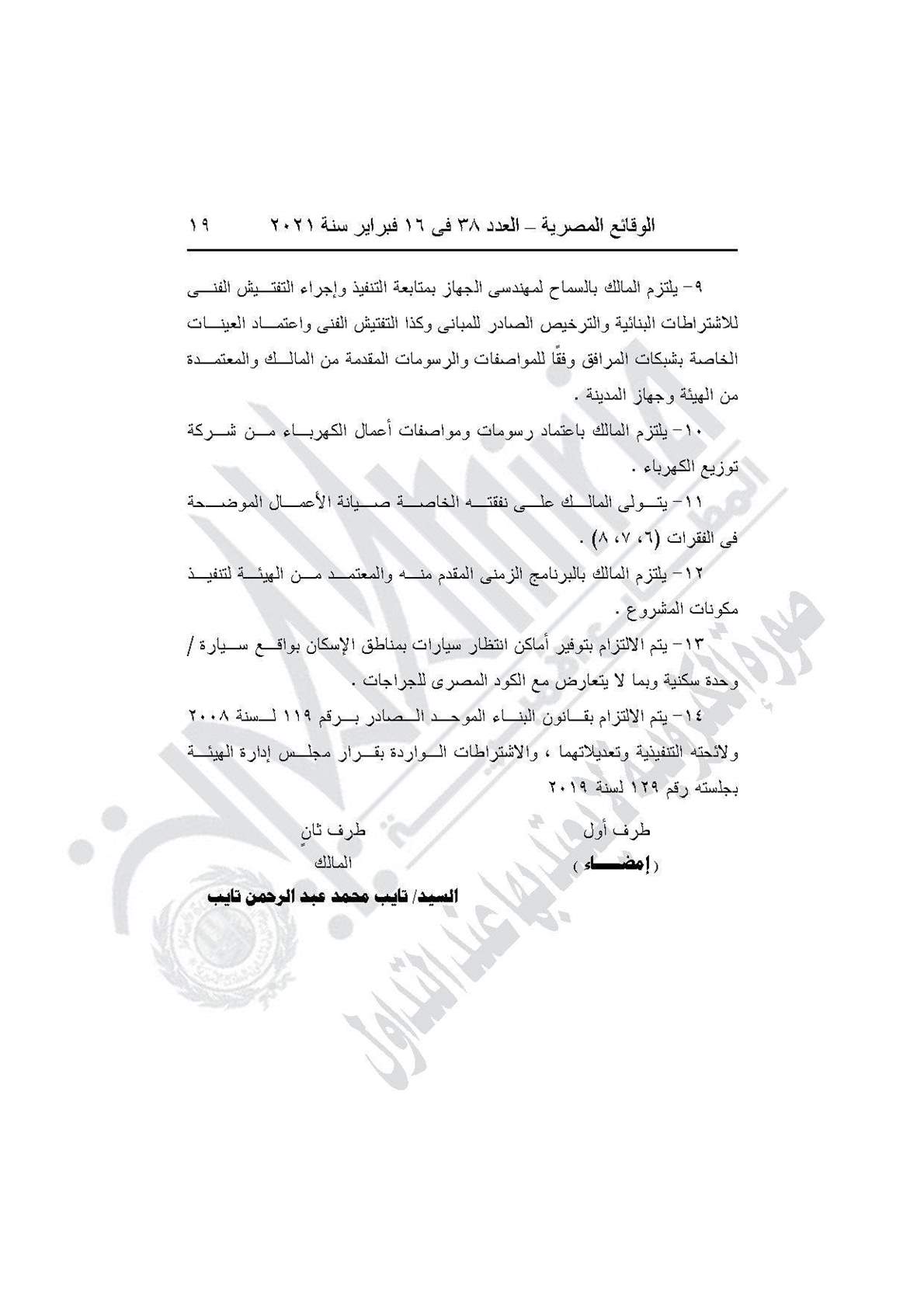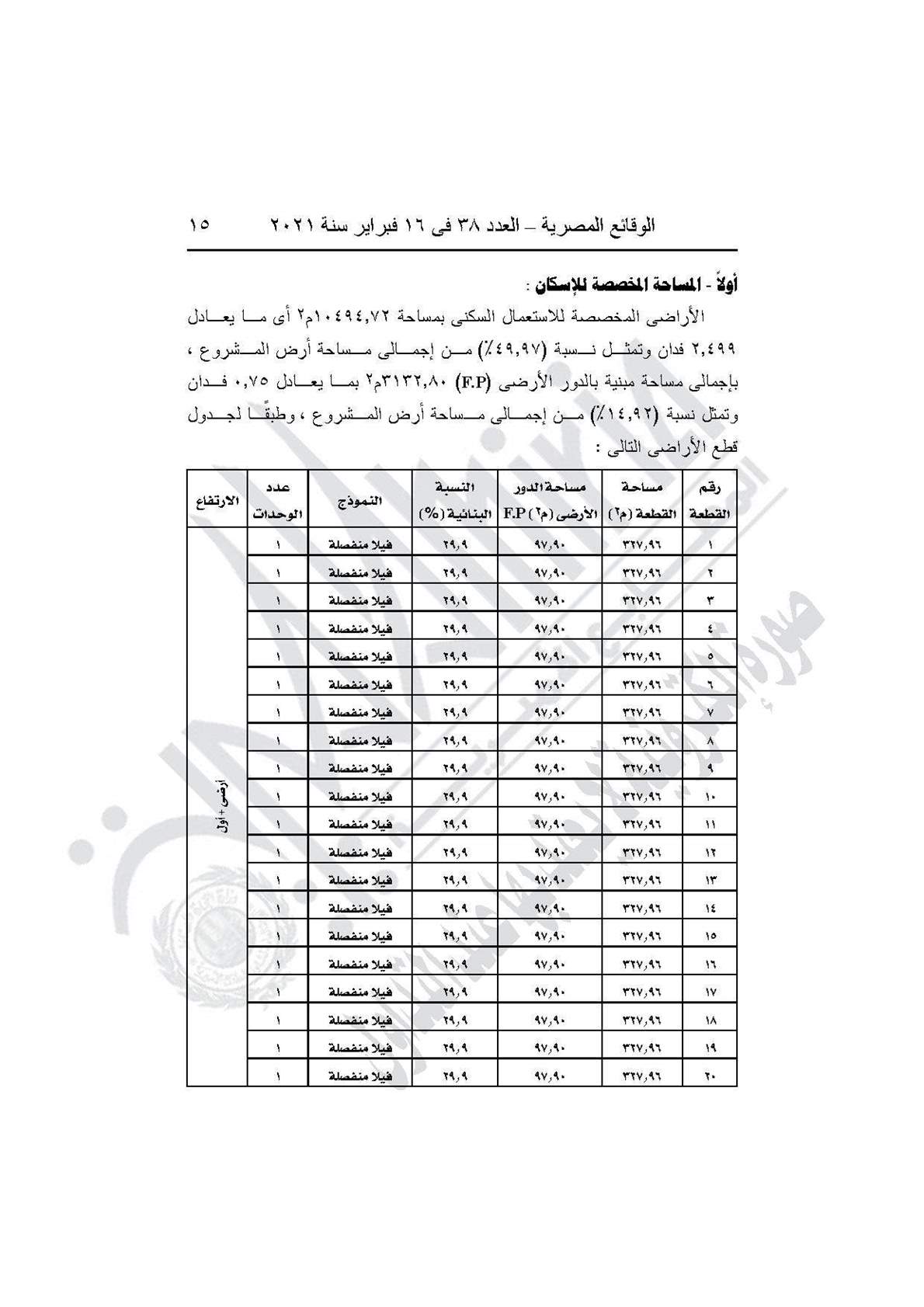 وينص القرار على اعتماد تخطيط وتقسيم قطعة الأرض رقم (14 أ) بمساحة 5 أفدنة بما يعادل 21000م2تر مربع، الواقعة بالحوض رقم (2) بالحزام الأخضر بمدينة 6 أكتوبر، والمخصصة لـ تايب محمد عبد الرحمن تايب؛ لإقامة مشروع سكنى بمقابل نقدى، وذلك طبقًا للحدود الموضحة على الخريطة المرفقة بهذا القرار والعقد المبرم بتاريخ 22/1/2019 والتى تعتبر جميعها مكملة لهذا القرار.
