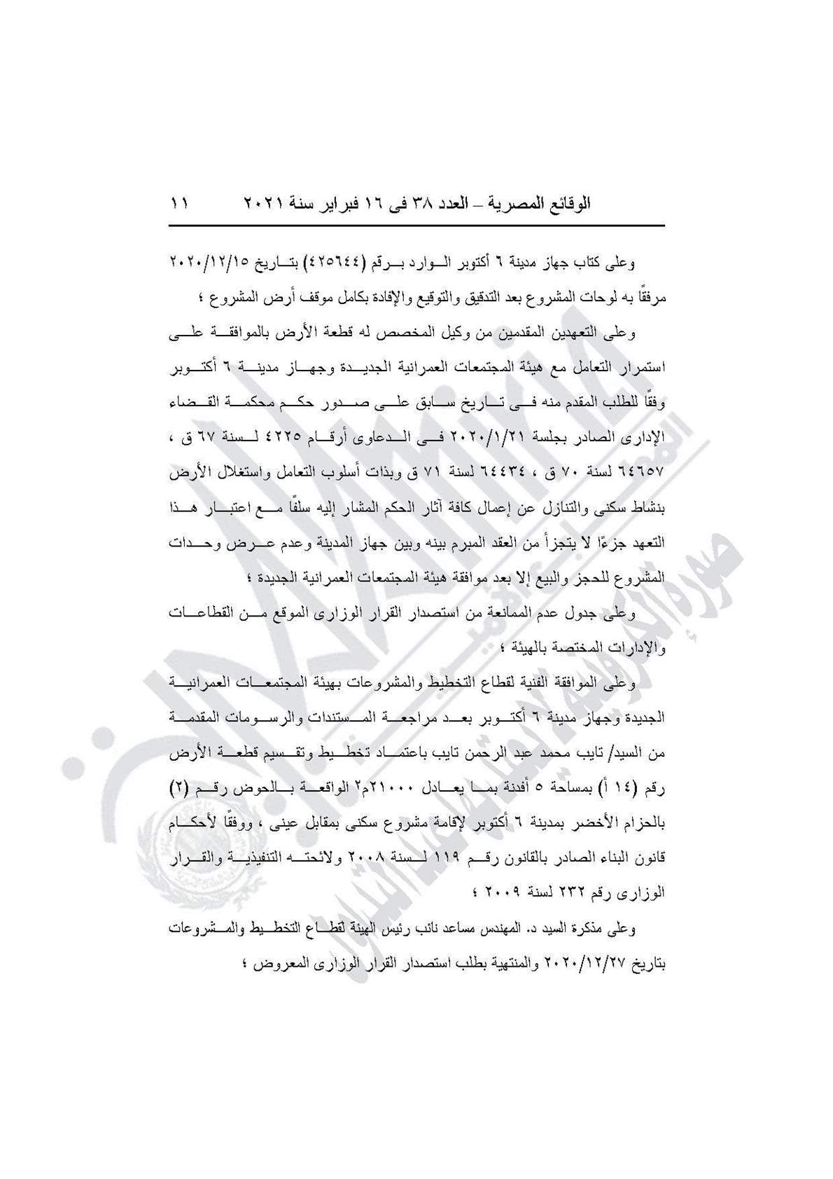 وجاء في المادة الثانية للقرار "يلتزم المخصص له بالتعهد الموقع منه باستمرار التعامل مع الهيئة وجهاز المدينة وفقًا للطلب المقدم منه فى تاريخ سابق على صدور حكم محكمة القضاء الإدارى الصادر بجلسة 21/1/2020 فى الدعاوى أرقام 4225 لسنة 67 ق، 64657 لسنة 70 ق، 64434 لسنة 71 ق؛ وبذات أسلوب التعامل واستغلال الأرض بنشاط سكنى والتنازل عن إعمال كافة آثار الحكم المشار إليه سلفًا مع اعتبار هذا التعهد جزءًا لا يتجزأ من العقد المبرم بينه وبين جهاز المدينة"