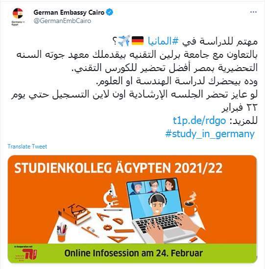 وكتبت السفارة الألمانية تغريدة على تويتر "مهتم للدراسة في #المانيا.. بالتعاون مع جامعة برلين التقنية بيقدملك معهد جوته السنه التحضيرية بمصر أفضل تحضير للكورس التقني وده بيحضرك لدراسة الهندسة او العلوم"