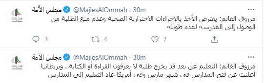 وكتب مجلس الأمة عبر حسابه الرسمي بتويتر "مرزوق الغانم: التعليم عن بعد قد يخرج طلبة لا يعرفون القراءة أو الكتابة.. وبريطانيا أعلنت عن فتح المدارس في شهر مارس وفي أمريكا عاد التعليم إلى المدارس".