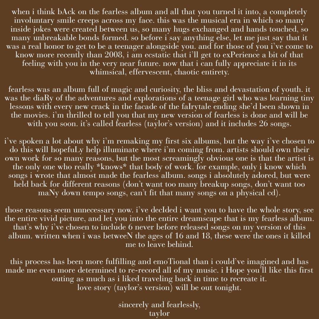 ورأت تايلور في منشورها أنه "يجب أن يمتلك الفنانون أعمالهم الخاصة لأسباب عديدة ، لكن أكثرها وضوحًا هو أن الفنان هو الوحيد الذي يعرف حقًا مجموعة العمل هذه"، ولم تحدد سويفت تاريخ لإصدار النسخة المعاد تسجيلها من Fearless .