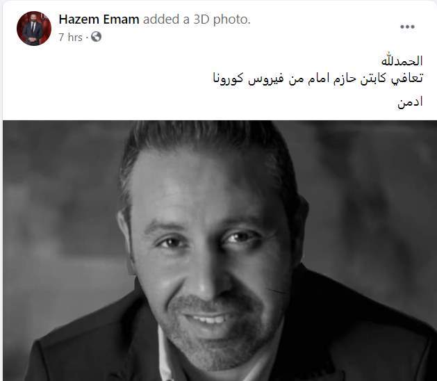 ونشرت الصفحة الرسمية لحازم إمام عبر «فيس بوك» صورة له وقالت: «الحمد لله تعافى كابتن حازم إمام من فيروس كورونا».