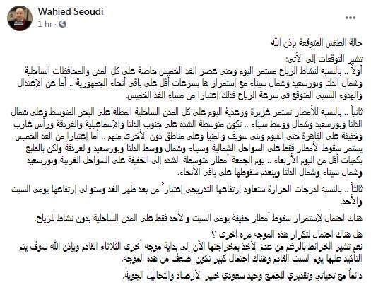 وعن حالة الطقس المتوقعة كتب وحيد سعودي تدوينة عبر حسابه الرسمي بالفيس بوك: "تشير التوقعات إلى الآتى: أولا: بالنسبة لنشاط الرياح مستمر اليوم وحتى عصر الغد الخميس خاصة على كل المدن والمحافظات الساحلية وشمال الدلتا وبورسعيد وشمال سيناء مع استمرار ها بسرعات أقل على باقى أنحاء الجمهورية .. أما عن الاعتدال والهدوء النسبى المتوقع فى سرعة الرياح فذلك اعتبارا من مساء الغد الخميس".