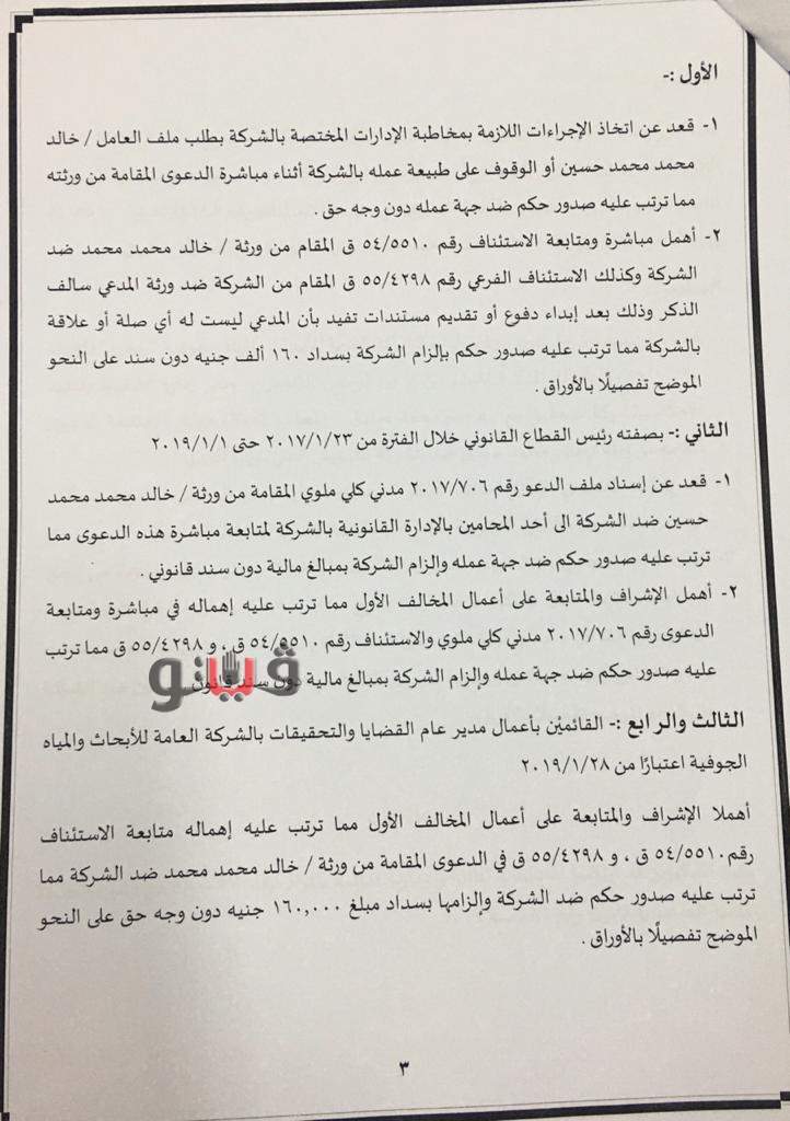 وتقاعس ورئيس القطاع القانوني السابق لطفي عواد عزب خلال الفترة من 23 يناير 2017 حتى أول يناير يناير 2019 عن إسناد ملف الدعوى رقم 706 لسنة 2017 مدني كلي ملوي المقامة من ورثة العامل ضد الشركة إلى أحد المحامين بالإدارة القانونية لمباشرتها مما ترتب عليه صدور حكم ضد جهة عمله بإلزامها بسداد مبالغ مالية دون سند قانوني.