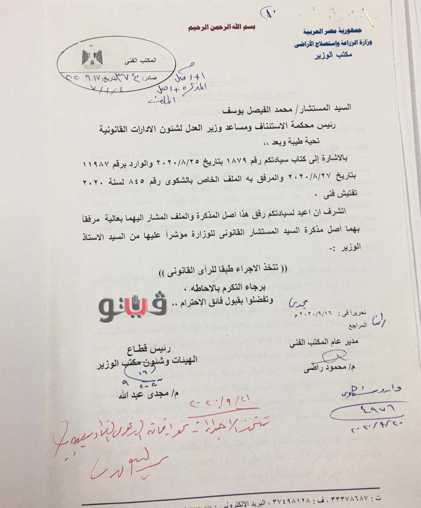 جاء ذلك في مذكرة أرسلها رئيس قطاع الهيئات وشؤون مكتب الوزير إلى مساعد وزير العدل لشؤون الإدارات القانونية، ردًا على خطابه المرفق به ملف الشكوى رقم 845 لسنة 2020 تفتيش فني، مؤكدًا موافقة الوزير على الإحالة للمحاكمة.