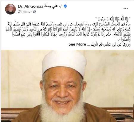 وكتب علي جمعة تدوينة على الفيس بوك: "إِنَّا لِلَّهِ وَإِنَّا إِلَيْهِ رَاجِعُونَ"، جاءَ في الحديثِ الصَّحيحِ الذي رواه الشيخان عن ابنِ عَمروٍ رَضِيَ اللهُ عنهُما قال: قال صَلَّى اللهُ عَلَيْهِ وَعلى آلِهِ وَصَحْبِهِ وَسَلَّمَ: «إِنَّ اللهَ لَا يَقْبِضُ الْعِلْمَ انْتِزَاعاً يَنْتَزِعُهُ مِن النَّاسِ، وَلَكِنْ يَقْبِضُ الْعِلْمَ بِقَبْضِ الْعُلَمَاءِ، حَتَّى إِذَا لَمْ يَتْرُكْ عَالِماً اتَّخَذَ النَّاسُ رُؤُوساً جُهَّالاً فَسُئِلُوا فَأَفْتَوْا بِغَيْرِ عِلْمٍ فَضَلُّوا وَأَضَلُّوا».