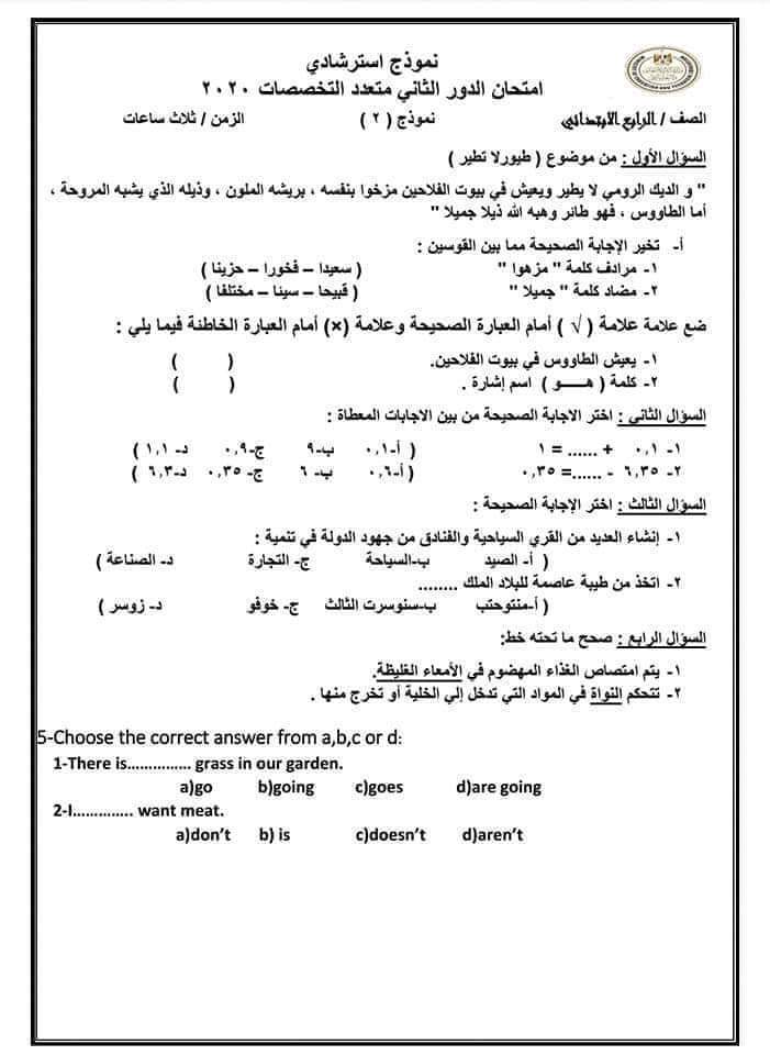 1-الامتحان سيكون عبارة عن ورقة واحدة تحتوي على أسئلة من كل المواد الأساسية التي يدرسها الطلاب (عربي، إنجليزي، رياضة، علوم، جغرافيا).