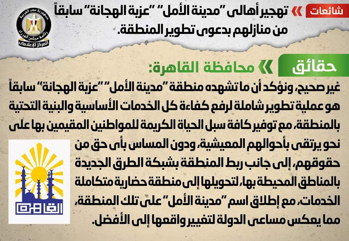 وقام المركز الإعلامي لمجلس الوزراء بالتواصل مع محافظة القاهرة، والتي نفت تلك الأنباء، مُؤكدةً أنه لا صحة لتهجير أهالي "مدينة الأمل" "عزبة الهجانة" سابقاً من منازلهم.