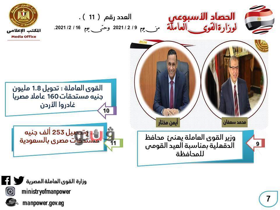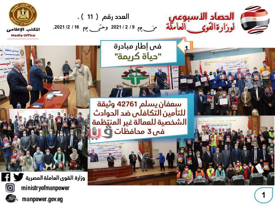 شهد حصاد الأسبوع الحالي، في وزارة القوى العاملة العديد من الأخبار المهمة - من 9 إلى 16 فبراير الجاري- حيث سليم وزير القوي العاملة محمد سعفان 42 ألفا و761 وثيقة للتأمين التكافلي ضد الحوادث الشخصية وتغطي الوفاة، والعجز الكلى المستديم والتي أصدرتها الوزارة للعمالة غير المنتظمة بمحافظات القليوبية والقاهرة والجيزة.