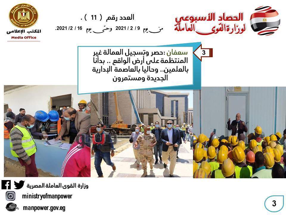 وواصل الوزير نشاطه الأسبوعي بديوان عام الوزارة، حيث قام يرافقه اللواء خالد عبد العال محافظ القاهرة، بتسليم وثائق للتأمين التكافلى ضد الحوادث الشخصية وتغطي الوفاة، والعجز الكلى المستديم، والجزئي والتي أصدرتها الوزارة لـ 31 ألفاً و196 عاملاً غير منتظم مسجلين بقاعدة البيانات بمديرية القوى العاملة بالقاهرة ، وقد تحملت تكلفتها حسابات رعاية العمالة غير المنتظمة بالمديرية.