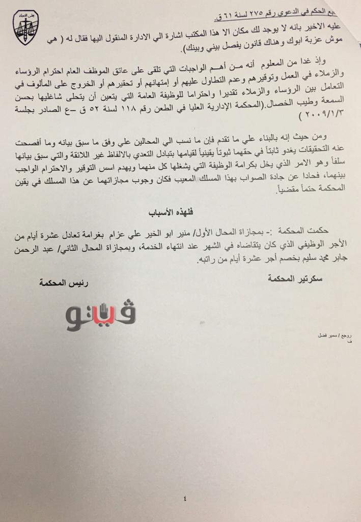 وكشفت أسباب الحكم أن عبد الرحمن جابر محمد، كبير أخصائيين بمديرية التضامن الإجتماعي بمحافظة شمال سيناء تحدث مع المخالف الأول بإسلوب غير لائق خلال محادثة هاتفية بينهما رغم كونه هو رئيسه الأعلى