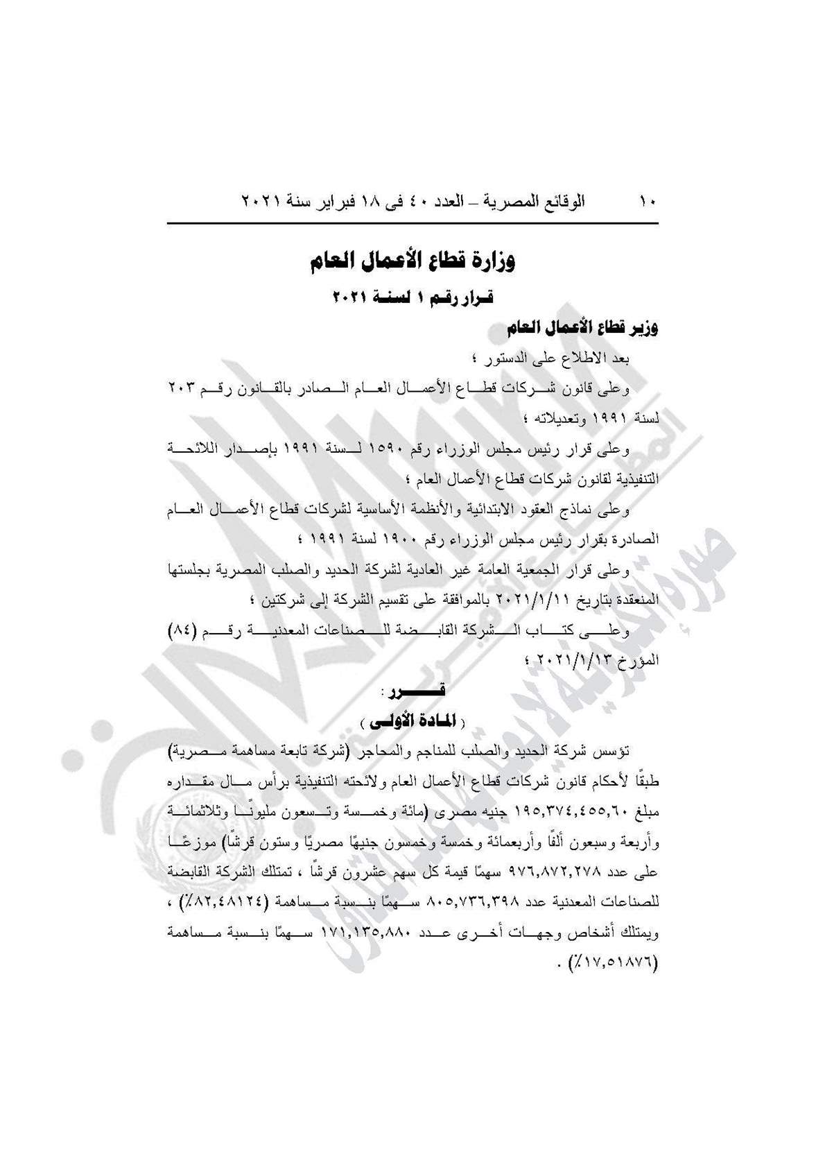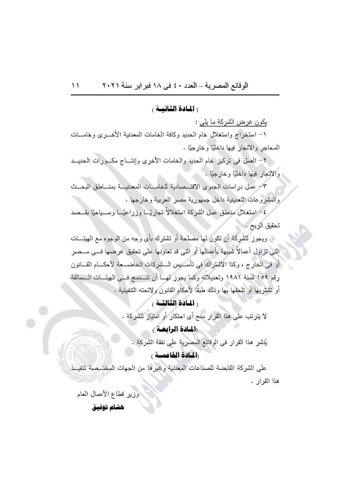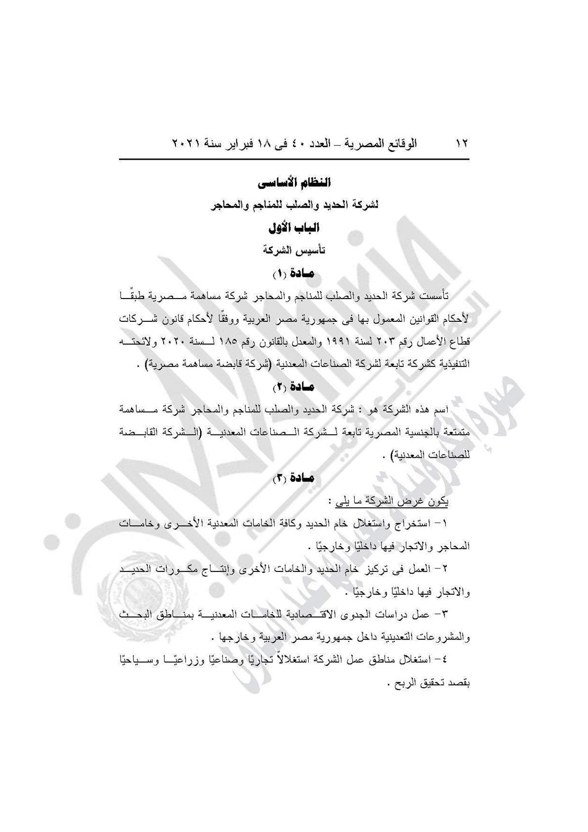 نشرت جريدة الوقائع المصرية في عددها رقم 40، الصادر في 18 فبراير 2021، قرار وزارة قطاع الأعمال العام رقـم 1 لسنـة 2021، بشأن تأسيس شركة الحديد والصلب للمناجم والمحاجر (شركة تابعة مساهمة مصرية) طبقًا لأحكام قانون شركات قطاع الأعمال العام ولائحته التنفيذية.