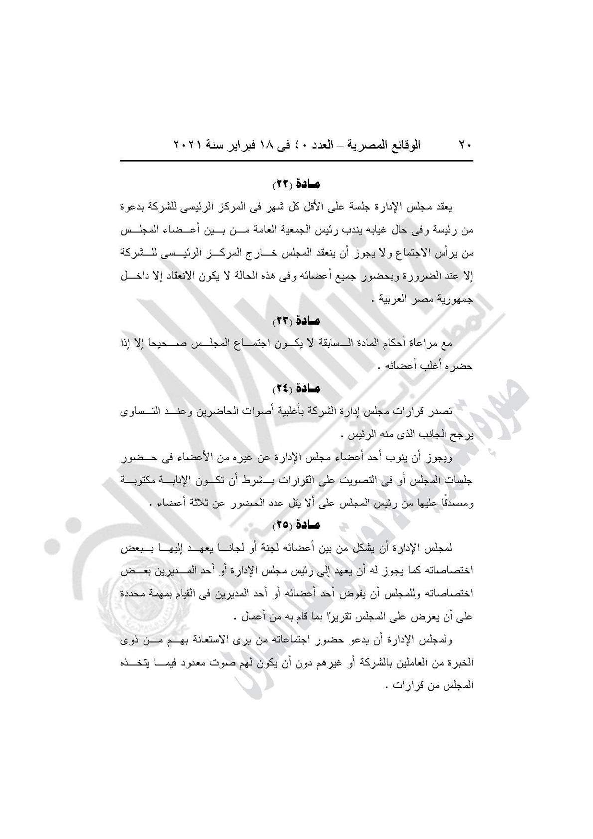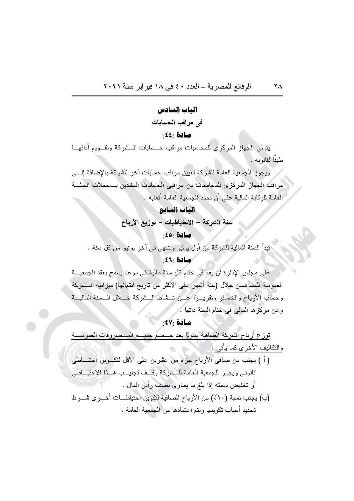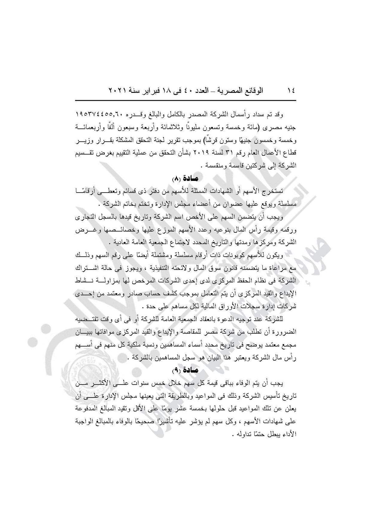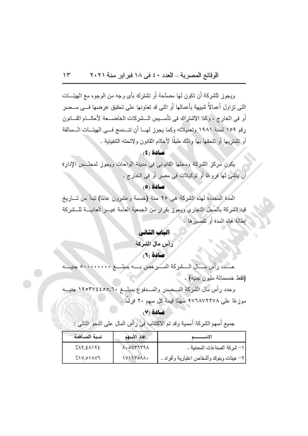 ويجوز للشركة أن تكون لها مصلحة أو تشترك بأى وجه من الوجوه مع الهيئات التى تزاول أعمالاً شبيهة بأعمالها أو التى قد تعاونها على تحقيق غرضها فى مصر أو فى الخارج، وكذا الاشتراك فى تأسيس الشركات الخاضعة لأحكام القانون.