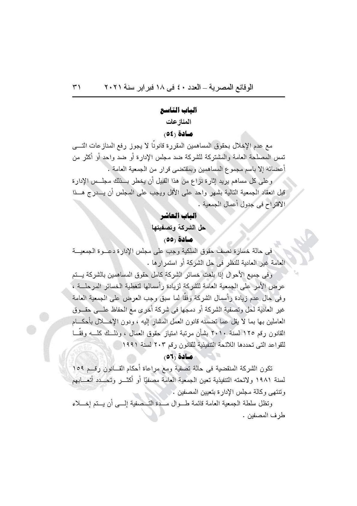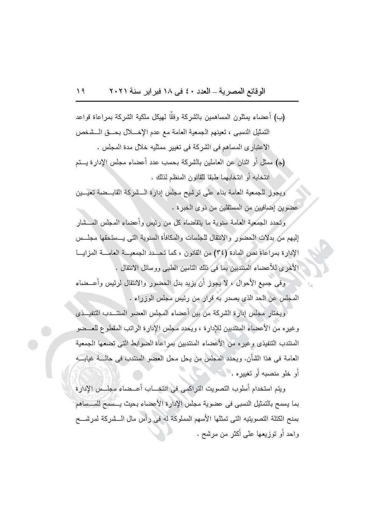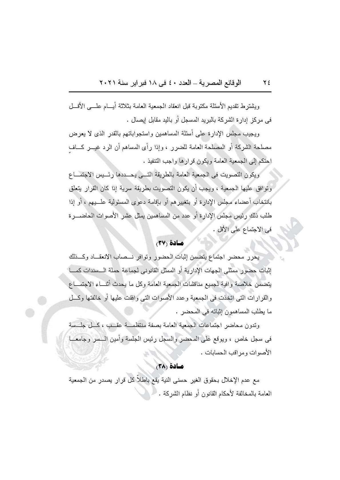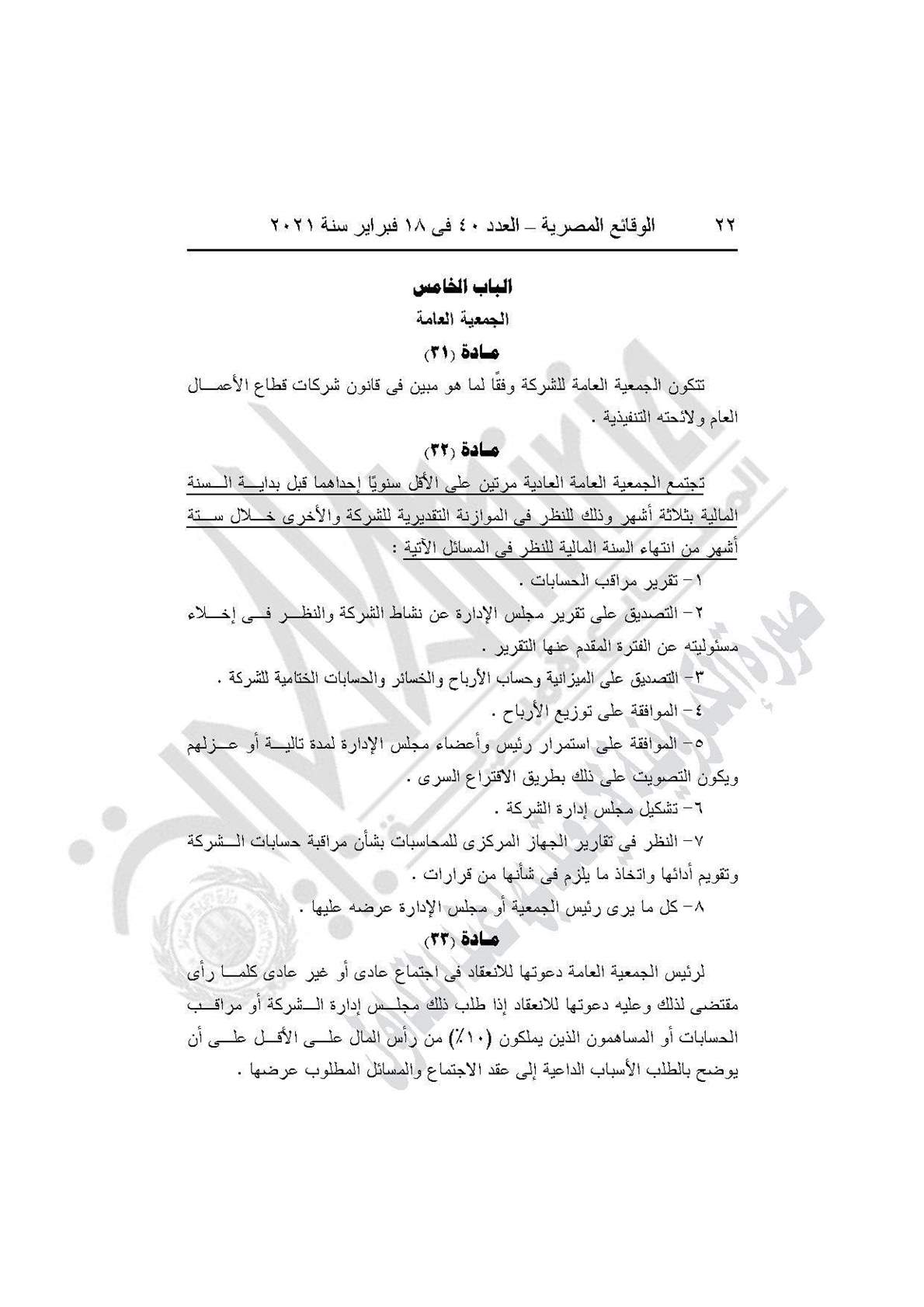 ويجوز للشركة أن تكون لها مصلحة أو تشترك بأى وجه من الوجوه مع الهيئات التى تزاول أعمالاً شبيهة بأعمالها أو التى قد تعاونها على تحقيق غرضها فى مصر أو فى الخارج، وكذا الاشتراك فى تأسيس الشركات الخاضعة لأحكام القانون.