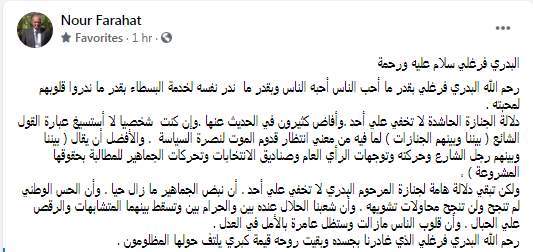 وكتب نور فرحات تدوينة على الفيس بوك "البدري فرغلي سلام عليه ورحمة، رحم الله البدري فرغلي بقدر ما أحب الناس أحبه الناس وبقدر ما ندر نفسه لخدمة البسطاء بقدر ما ندروا قلوبهم لمحبته"