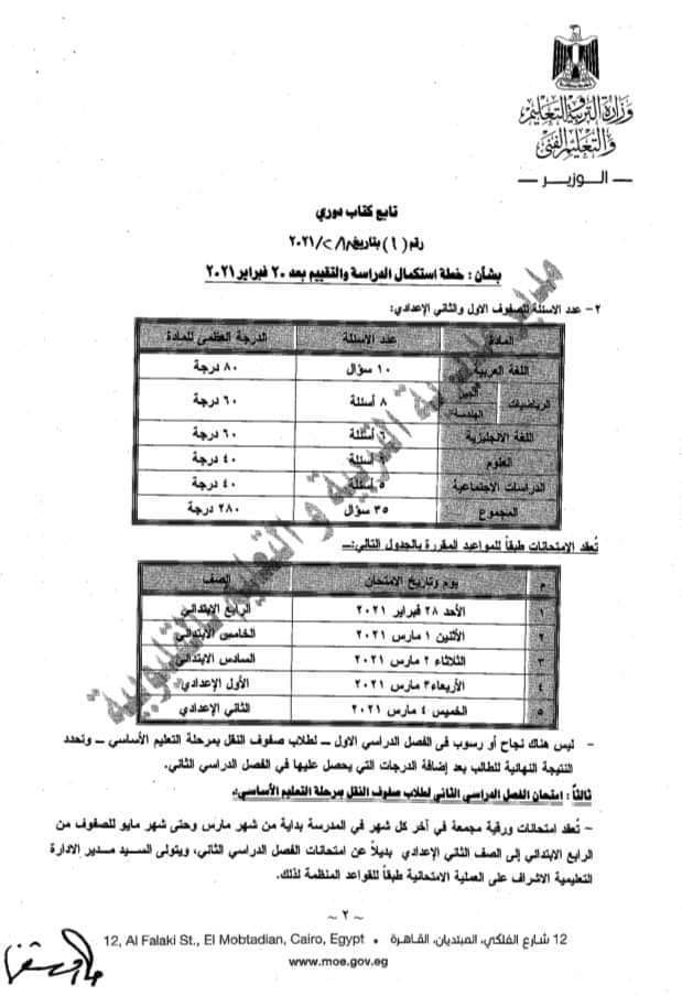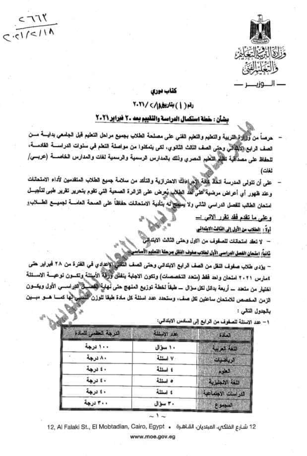 وكان أعلن الدكتور طارق شوقي وزير التربية والتعليم والتعليم الفني، مساء، اليوم، في كلمة له تم إذاعتها عبر القناة التعليمية "مدرستنا 1"، عن عدة قرارات بشأن تفاصيل وآلية إجراء امتحانات الفصل الدراسي الأول وكذلك آلية استئناف الدراسة بالفصل الدراسي الثاني، وذلك في ضوء توجيهات رئيس الجمهورية وقرارات اللجنة العليا لإدارة أزمة فيروس كورونا المستجد وتقديرًا للأوضاع في ظل استمرار تداعيات جائحة كورونا.