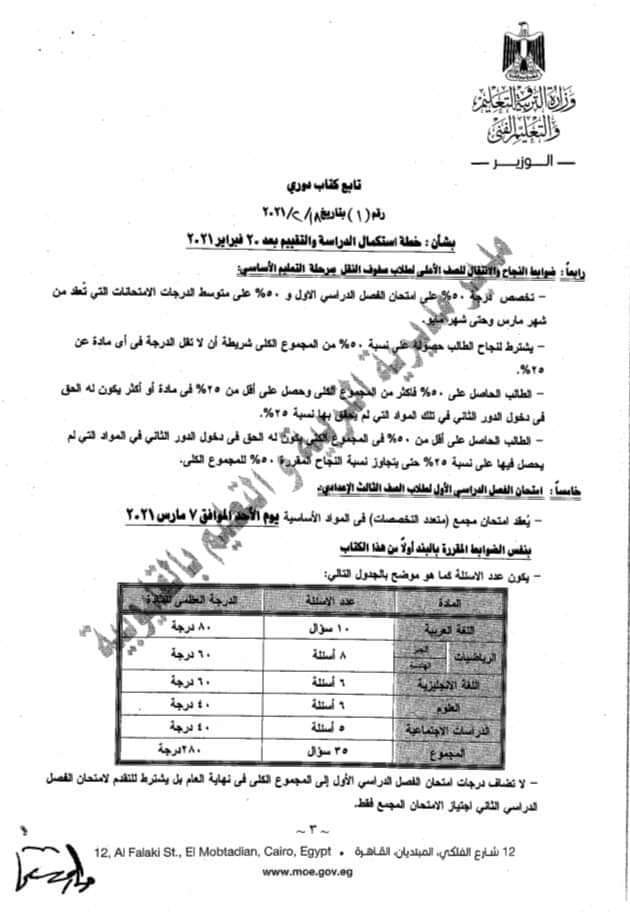 وكشفت الوزارة أنه في الصفوف الدراسية الأول والثاني الإعدادي في اللغة العربية 10 أسئلة بـ 80 درجة وفي الرياضيات 8 أسئلة جبر وهندسة بـ 60 درجة والإنجليزي 6 أسئلة بـ 60 درجة والعلوم 6 أسئلة بـ 40 درجة والدراسات 5 أسئلة بـ 40 درجة ومجموع الطالب في الأسئلة 35 سؤالا بـ 280 درجة.
