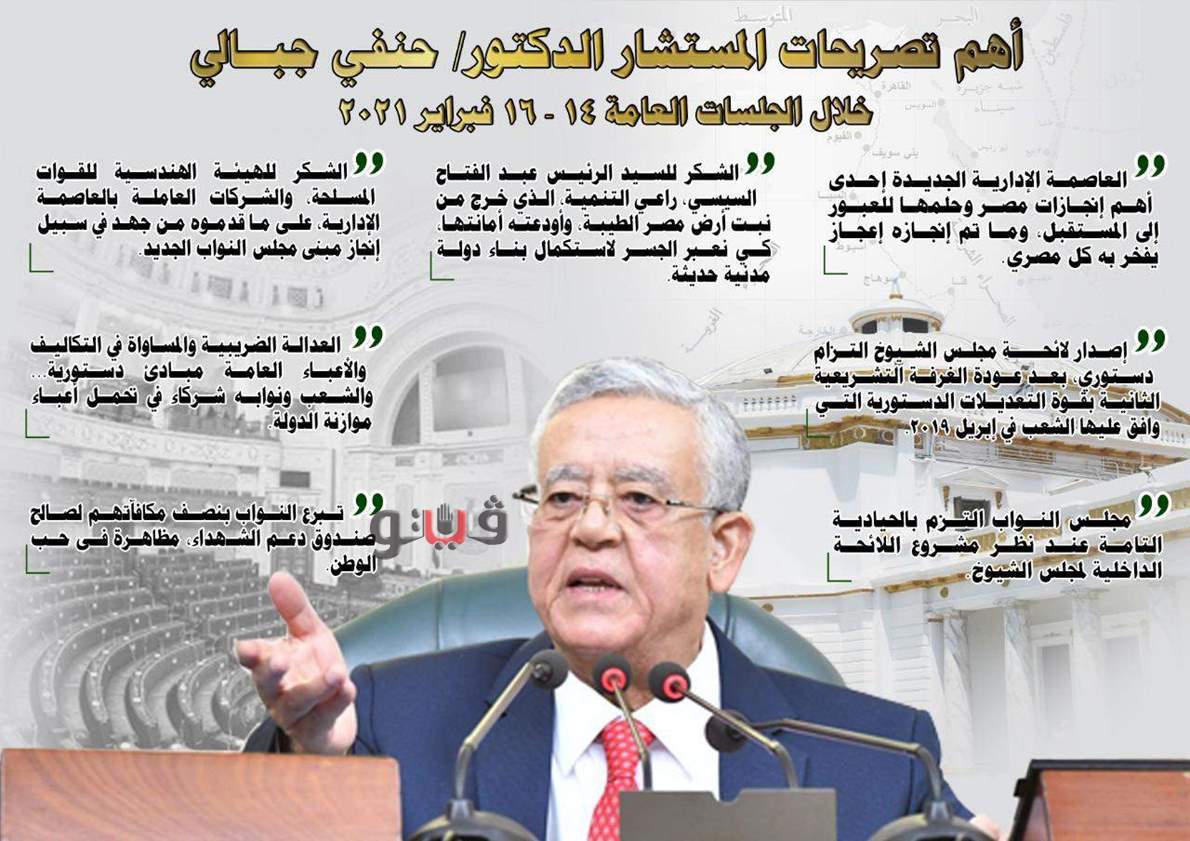وجه المستشار حنفي جبالي، رئيس مجلس النواب، عدة رسائل خلال زيارته للعاصمة الإدارية الجديدة، وأثناء جلسات البرلمان الثلاثة.