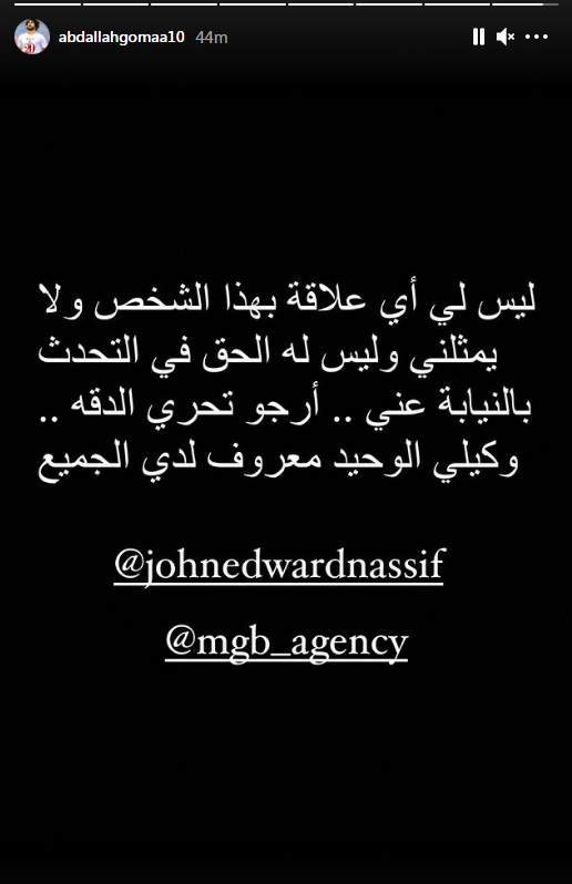وكتب عبد الله جمعة عبر "ستوري انستجرام" قائلا: "ليس لي أي علاقة بهذا الشخص ولا يمثلني وليس له الحق في التحدث بالنيابة عني .. أرجو تحري الدقة .. وكيلي الوحيد معروف لدى الجميع"، مشيرا إلى جون إداورد وكيل اللاعبين.