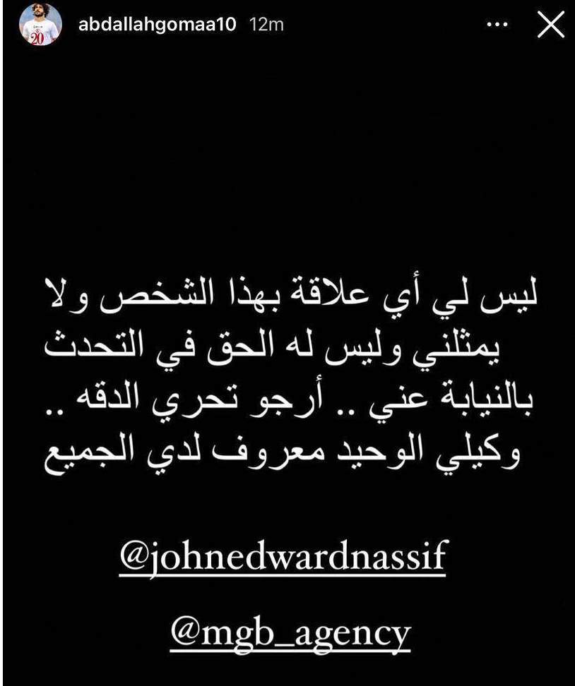 ونشر اللاعب عبر حسابه الرسمي على موقع التواصل الاجتماعي "إنستجرام": "ليست لي أي علاقة بهذا الشخص، ولا يمثلني وليس له الحق في التحدث بالنيابة عني، أرجو تحري الدقة، وكيلي الوحيد معروف لدى الجميع، وهو جون إدوارد".