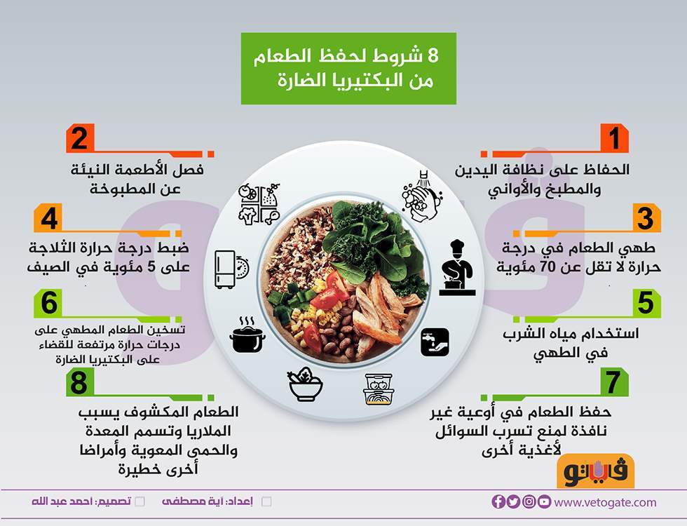 8 شروط لحفظ الطعام من البكتيريا الضارة | إنفوجراف الإثنين 22/فبراير/2021 - 12:13 م 2/22/2021 12:13:09 PM صورة أرشيفية آية مصطفى شارك طباعة 18 حجم الخط شارك طباعة فيروس كورونا كورونا تلوث الطعام مواصفات الغذاء الجيد