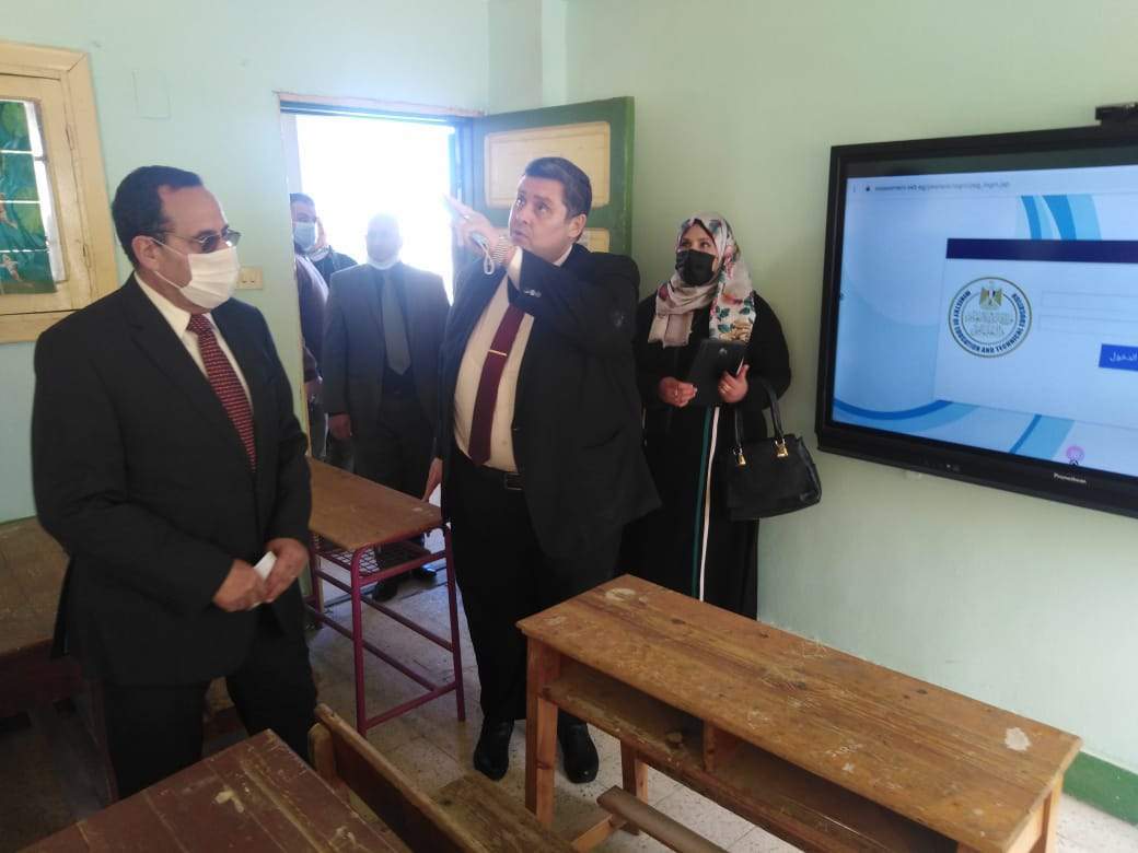 ورافقه حمزة رضوان وكيل وزارة التربية والتعليم والقيادات التعليمية، بتفقد قاعات الامتحانات ومتابعة استعدادات المدارس للامتحانات لأول مرة الكترونيا بسبب جائحة كورونا .