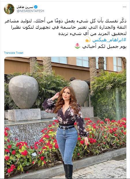 وكتبت نسرين طافش تغريدة على تويتر "ذكّر نفسك بأن كل شيء يعمل دومًا من أجلك، لتوليد مشاعر الثقة والجدارة التي تعتبر حاسمة في تجهيزك لتكون نظيرا لتحقيق المزيد من أي شيء تريده، #ابراهام_هيكس، يوم جميل لكم أحبائي"