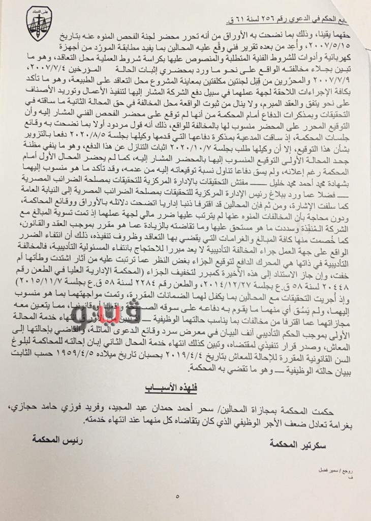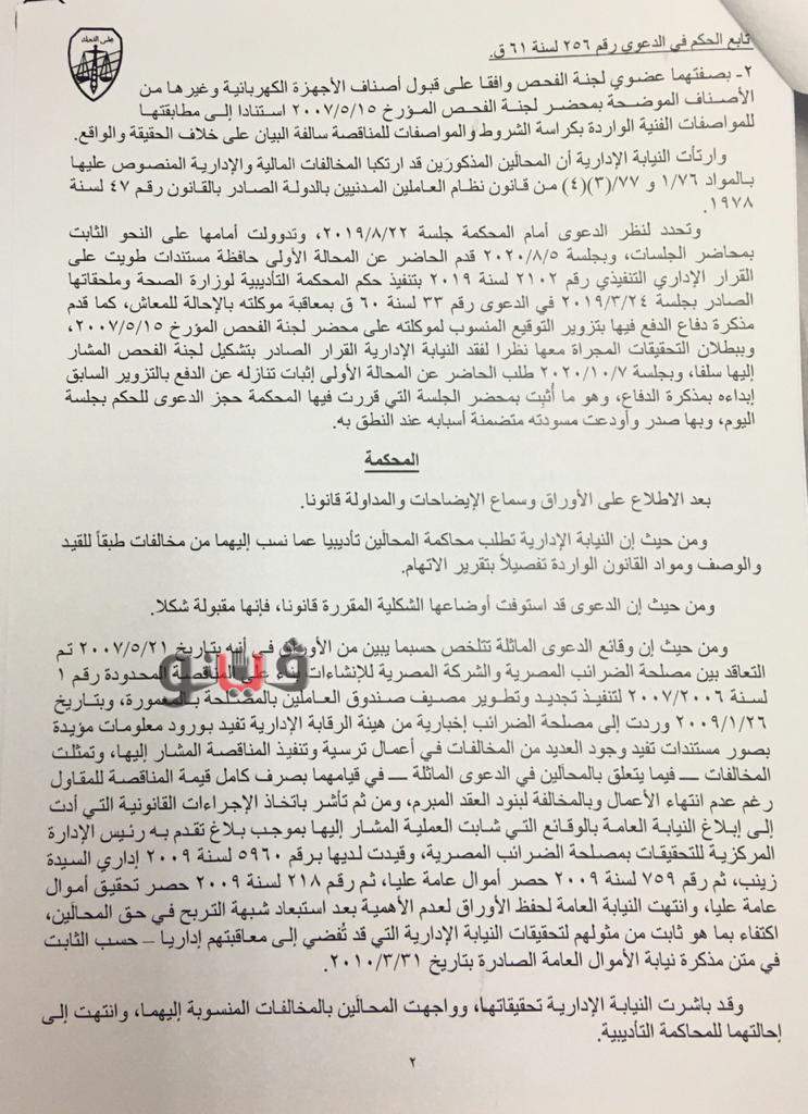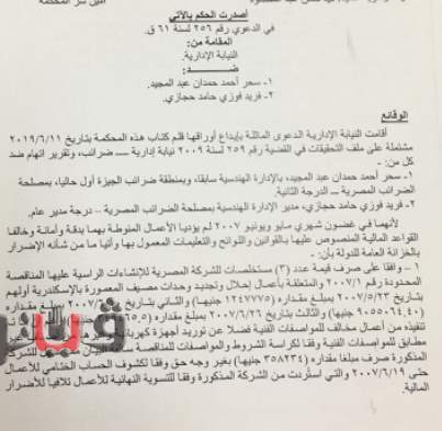 أكدت المحكمة صحة ما كشفت عنه تحقيقات النيابة الإدارية بأن سحر أحمد حمدان، المهندسة بمصلحة الضرائب المصرية وفريد فوزي حامد، مدير عام الإدارة الهندسية بالمصلحة لم يؤديا العمل المنوط بهما بدقة وأمانة وخالفا القواعد المنصوص عليها بالقوانين واللوائح والتعليمات المعمول بها وارتكبا ما من شأنه الإضرار بالخزانة العامة.
