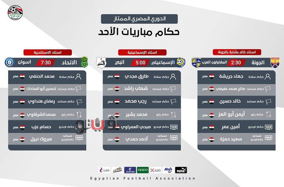 أعلنت لجنة الحكام الرئيسية بالاتحاد المصري لكرة القدم، أسماء حكام مباريات اليوم الأحد ببطولة الدوري الممتاز على النحو التالي: