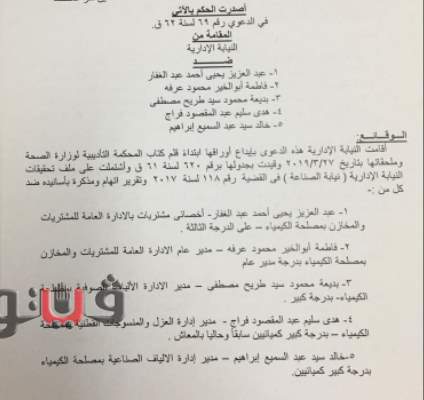 أصدرت المحكمة التأديبية العليا بمجلس الدولة حكمها في القضية رقم 69 لسنة 62 قضائية عليا بمجازاة 5 مسئولين من قيادات مصلحة الكيمياء بعد ثبوت إرتكابهم مخالفات مالية وإدارية جسيمة والإضرار بالمال العام وتربيح الغير دون وجه حق.