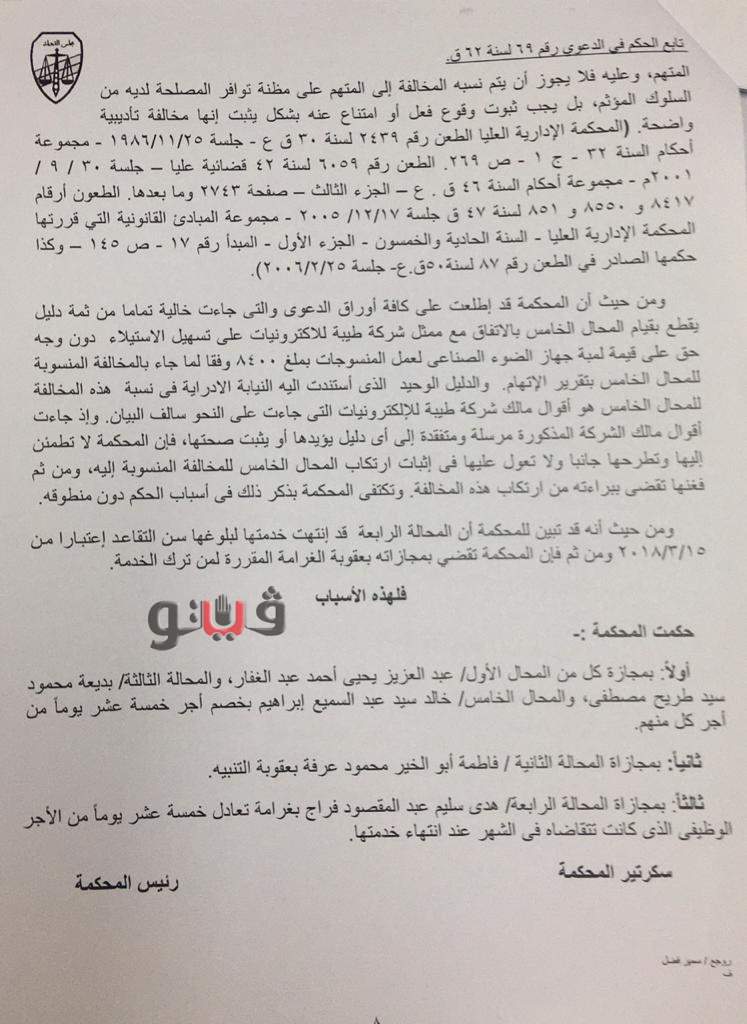 كما قضت بخصم أجر 15 يومًا من راتب بديعة محمود سيد طريح مصطفي مدير ادارة الالياف الصوفية، وتغريم هدى سليم عبد المقصود فراج، مديرة ادارة العزل والمنسوجات القطنية بما يعادل أجر 15 يومًا من راتبها عند انتهاء خدمتها، وخصم أجر 15 يومًا من راتب خالد سيد عبد السميع ابراهيم، مدير ادارة الالياف الصناعية لإعتمادهم مطابقه العطاءات المقدمة لاصلاح وصيانة جهاز الضوء الصناعي لمعمل المنسوجات فنيًا وماليًا رغم عدم عضويتهم بلجان البت الفني والمالي وحال كون العطاءات المقدمة متضمنة توريد وتركيب عدد 2 لمبة في حين أن الجهاز محل الاصلاح مجهزة ومزود بعدد لمبة واحدة مما ترتب عليه الاضرار وتسهيل الاستيلاء علي المال العام حال التعاقد علي خلاف الحقيقة بتوريد وتركيب عدد 2 لمبة بجهاز الضوء.
