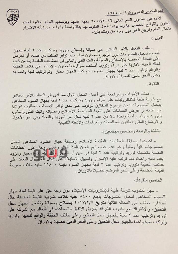وقالت التحقيقات ان المخالف لم يقم بالعرض على اللجنة المختصة بالاصلاح والصيانة والبت الفني والمالي في العطاءات المقدمة بما من شانه تعاقد جهة عمله على شراء وتوريد أصناف متوافرة بالمخازن والإدعاء على خلاف الحقيقة والواقع بتركيب عدد 2 لمبة بجهاز الضوء رغم كون الجهاز مجهز وتم توريد وتركيب لمبة واحدة به