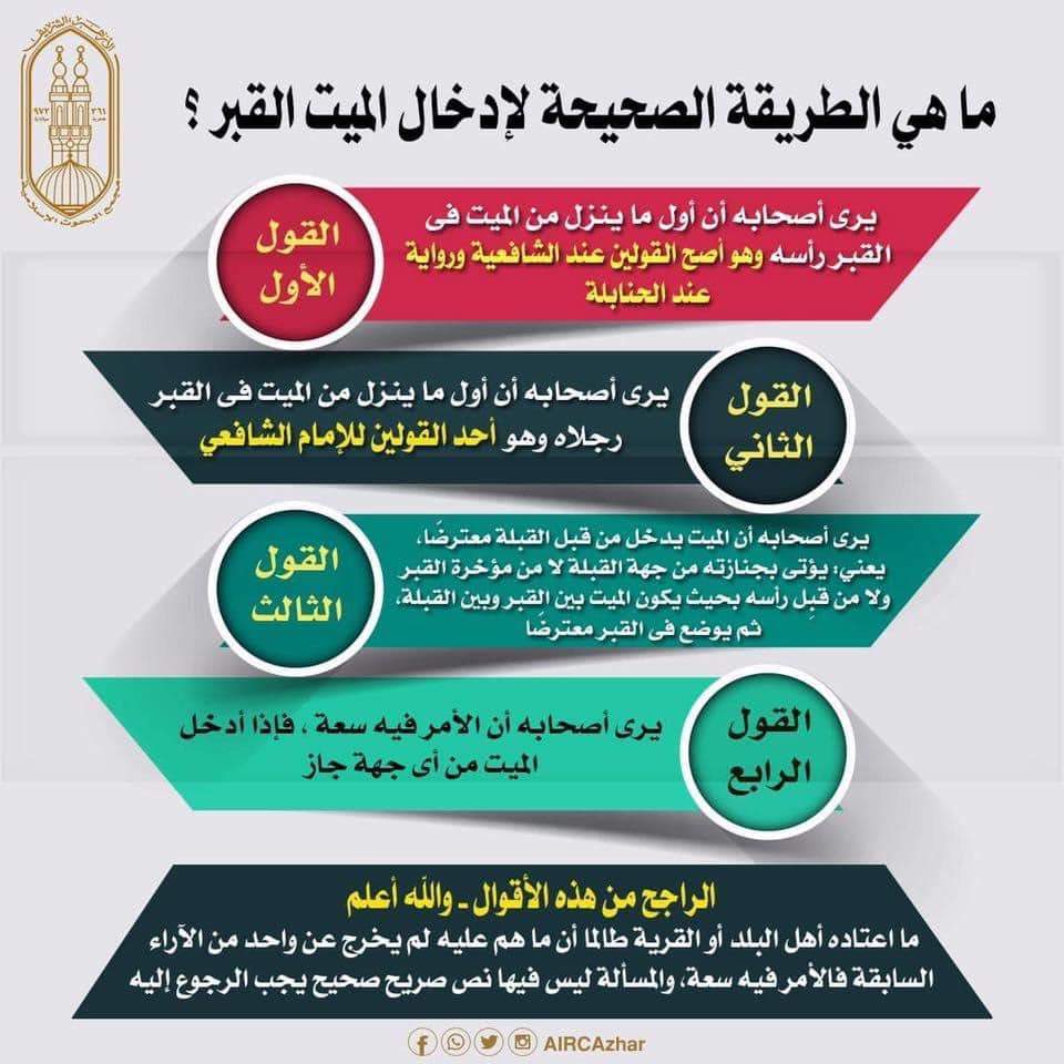 ورد سؤال إلى لجنة الفتوى بمجمع البحوث الإسلامية بالأزهر الشريف يقول فيه صاحبه: "ما هي الطريقة الصحيحة في إدخال الميت القبر؟، ومن جانبها ردت اللجنة على هذا السؤال كالتالي:
