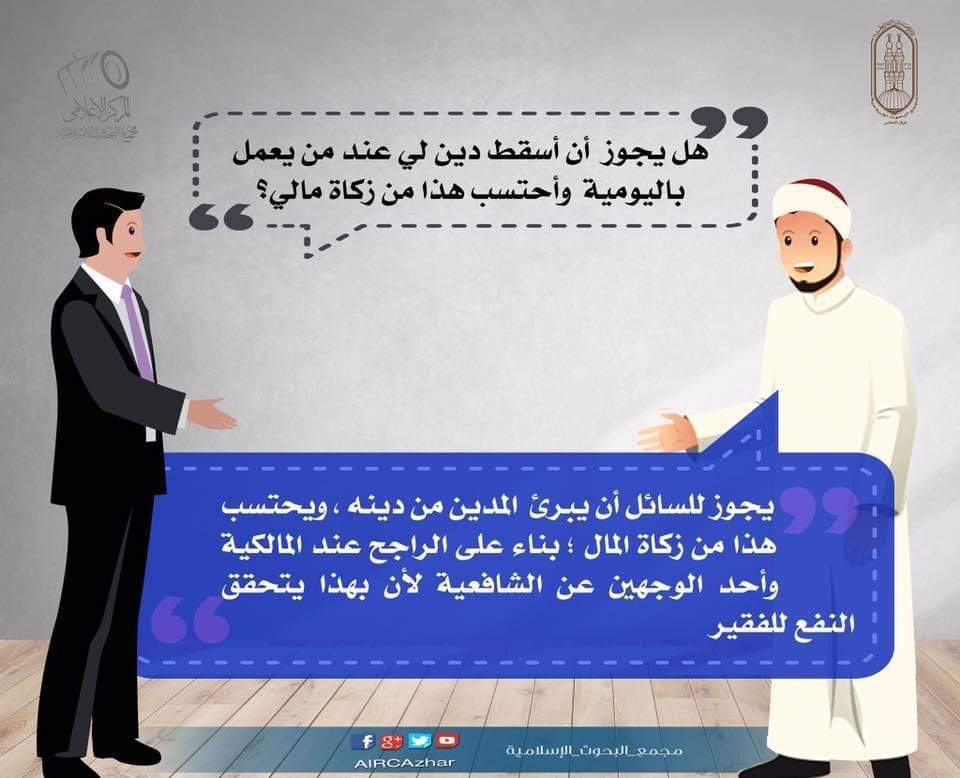 ورد سؤال إلى لجنة الفتوى بمجمع البحوث الإسلامية بالأزهر الشريف، يقول فيه صاحبه: "هل يجوز لي أن أعطي زكاة مالي لرجل كان يعمل باليومية، والآن انقطع عمله بسبب تفشي وباء كورونا، ولو كان لي دين عنده فهل يجوز لي أن أسقطه عنه وأحتسب هذا من زكاة مالي؟"، وجاء رد اللجنة على هذا السؤال كالتالي: