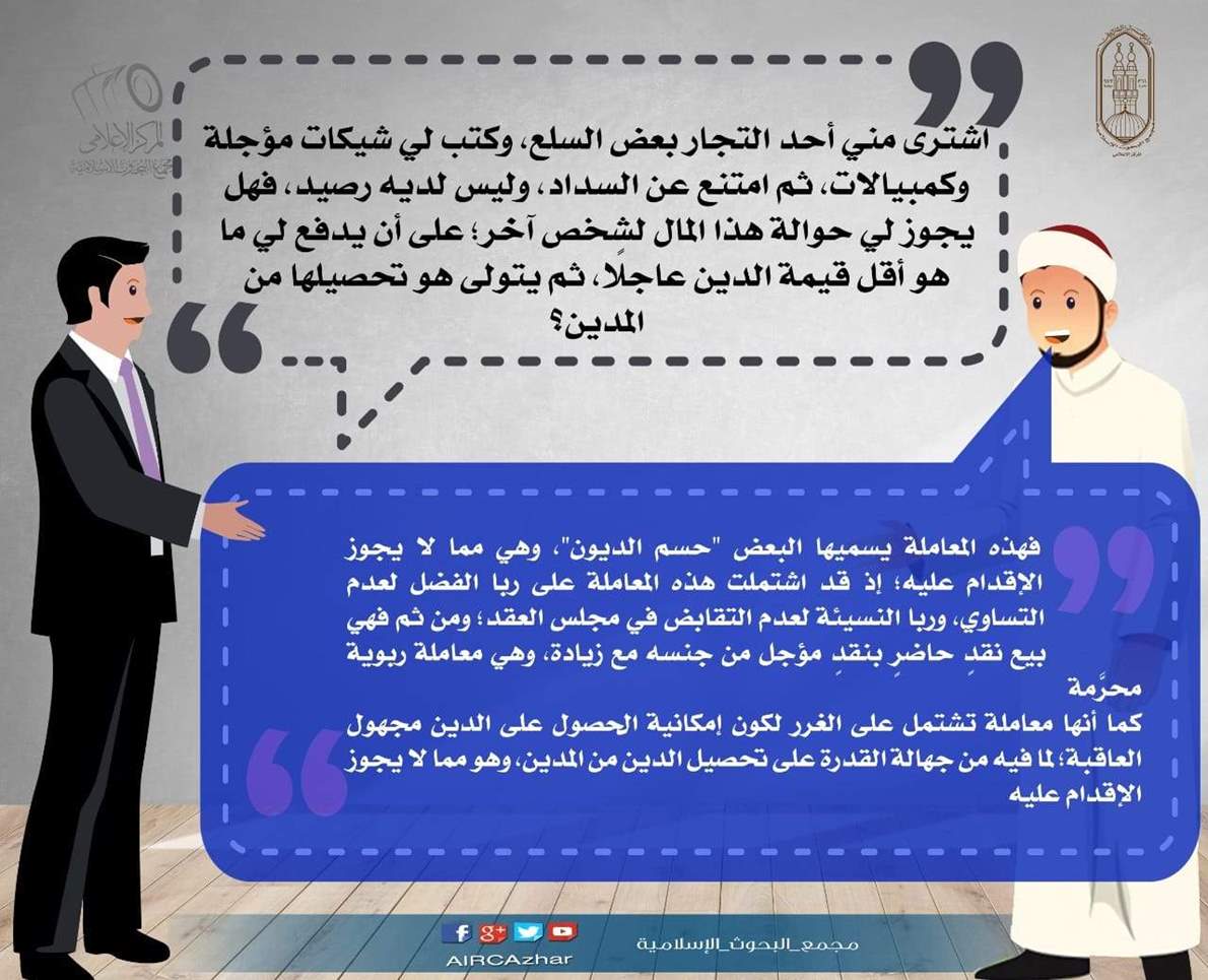 ورد سؤال إلى لجنة الفتوى بمجمع البحوث الإسلامية بالأزهر الشريف يقول فيه صاحبه: "اشترى مني أحد التجار بعض السلع، وكتب لي شيكات مؤجلة وكمبيالات، ثم امتنع عن السداد، وليس لديه رصيد، فهل يجوز لي حوالة هذا المال لشخص آخر؛ على أن يدفع لي ما هو أقل قيمة الدين عاجلًا، ثم يتولى هو تحصيلها من المدين؟"، وجاء رد الدار على هذا السؤال كالتالي: