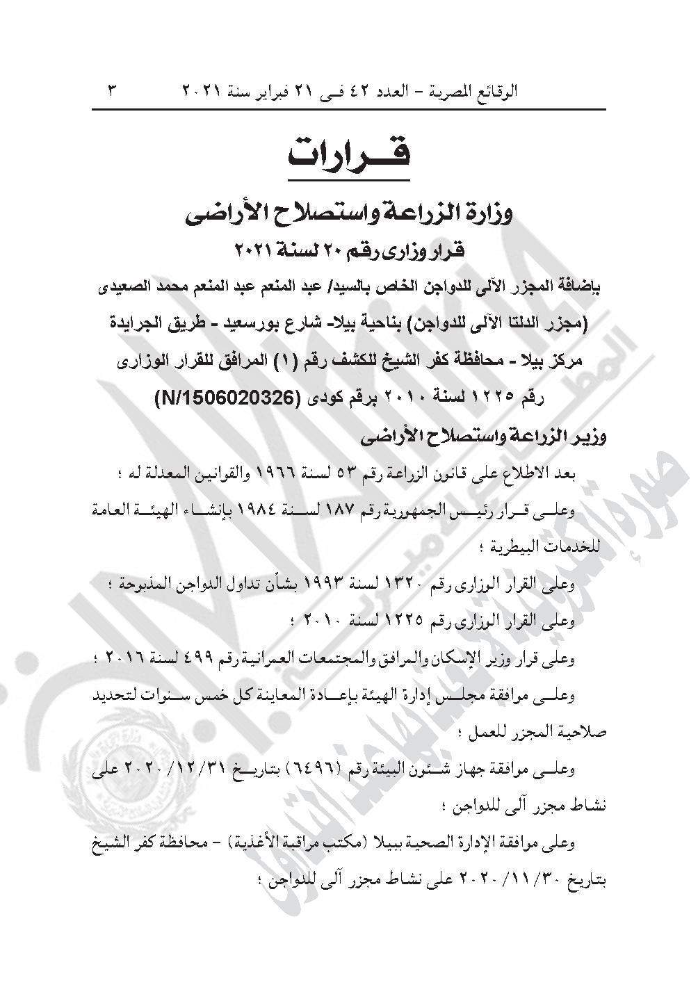 نشرت جريدة الوقائع المصرية في عددها رقم 42، الصادر في 21 فبراير 2021، قرار وزارة الزراعة واستصلاح الأراضي، بشأن إضافة مجزر آلى للدواجن بناحية بيلا - شارع بورسعيد - طريق الجرايدة مركز بيلا، محافظة كفر الشيخ.