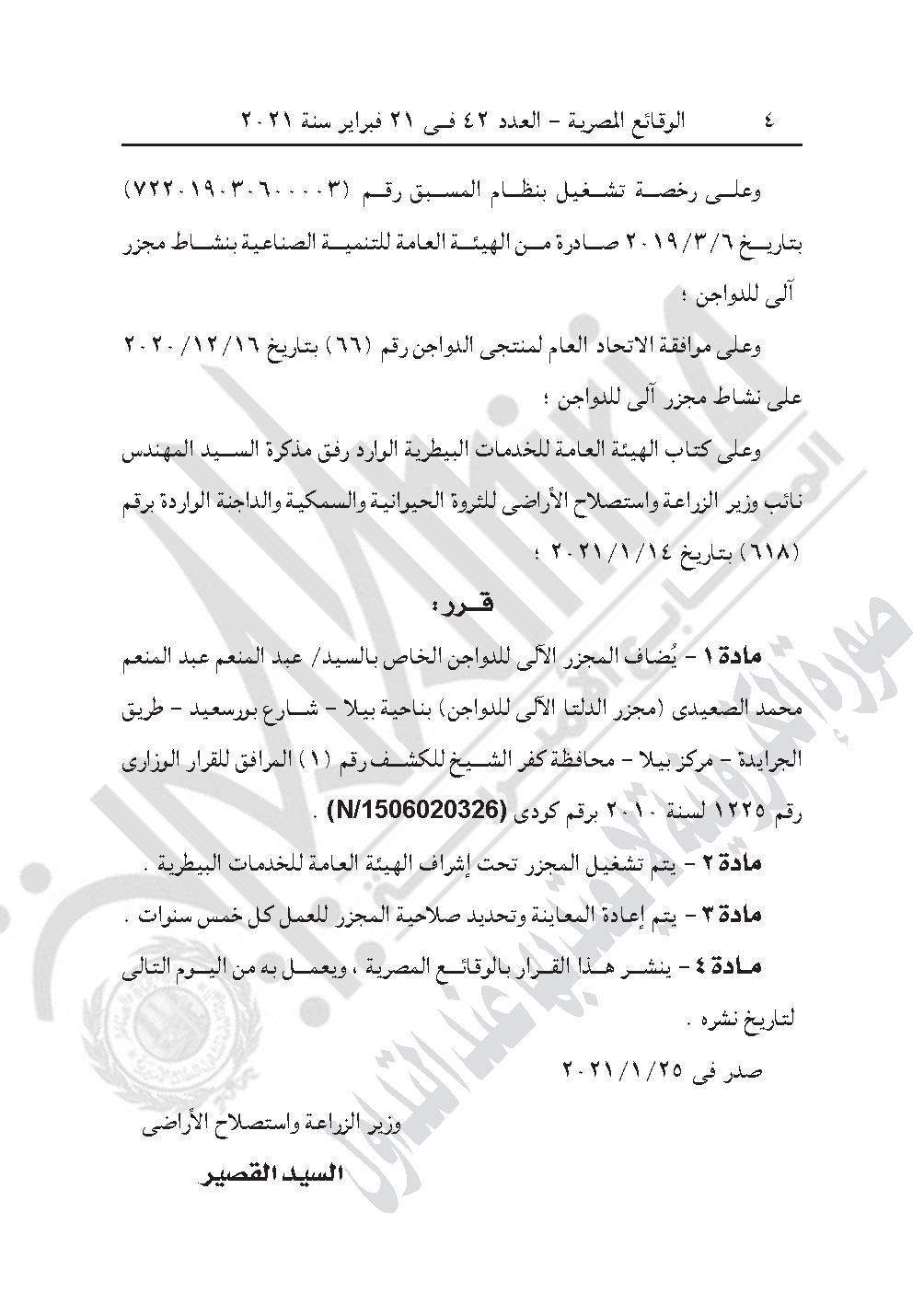 وينص القرار في مادته الأولى على بإضافة المجزر الآلى للدواجن الخاص بـ عبد المنعم عبد المنعم محمد الصعيدى (مجزر الدلتا الآلى للدواجن) بناحية بيلا- شارع بورسعيد - طريق الجرايدة مركز بيلا - محافظة كفر الشيخ للكشف رقم (1) المرافق للقرار الوزارى رقم 1225 لسنة 2010 برقم كودى (N/1506020326).