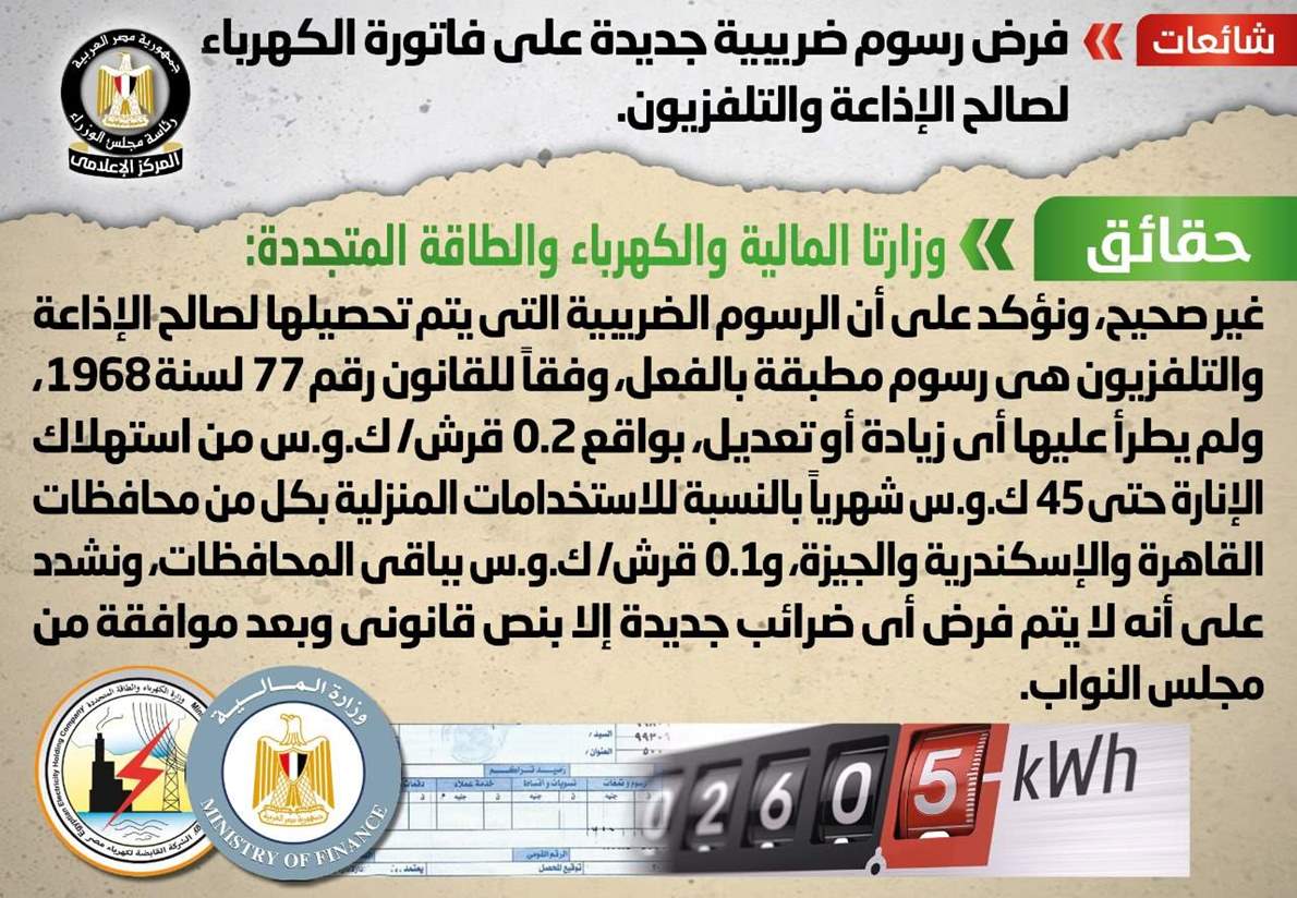 وتواصل المركز الإعلامي لمجلس الوزراء مع وزارتي المالية والكهرباء والطاقة المتجددة، وقد تم نفي تلك الأنباء، وأكدت الوزارتان أنه لا صحة لفرض أي رسوم ضريبية جديدة على فاتورة الكهرباء لصالح الإذاعة والتلفزيون.