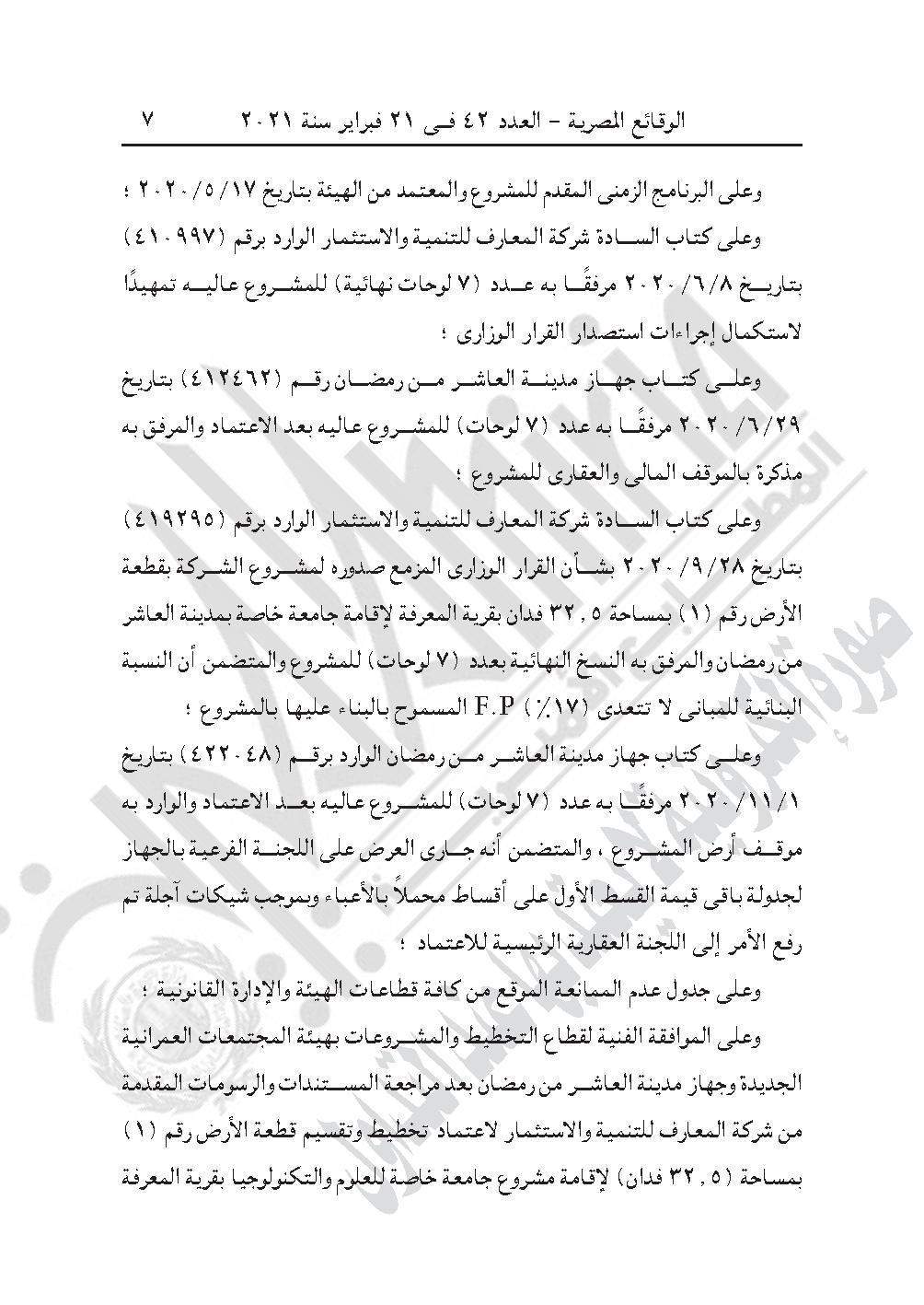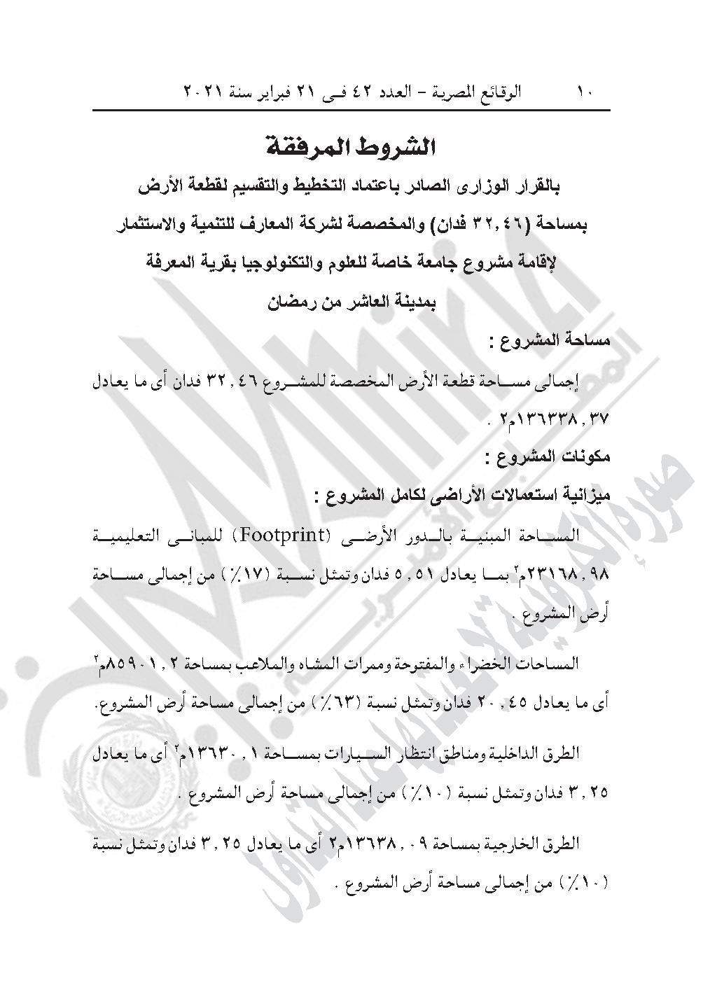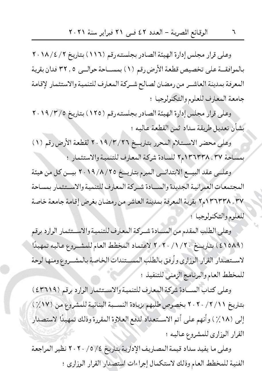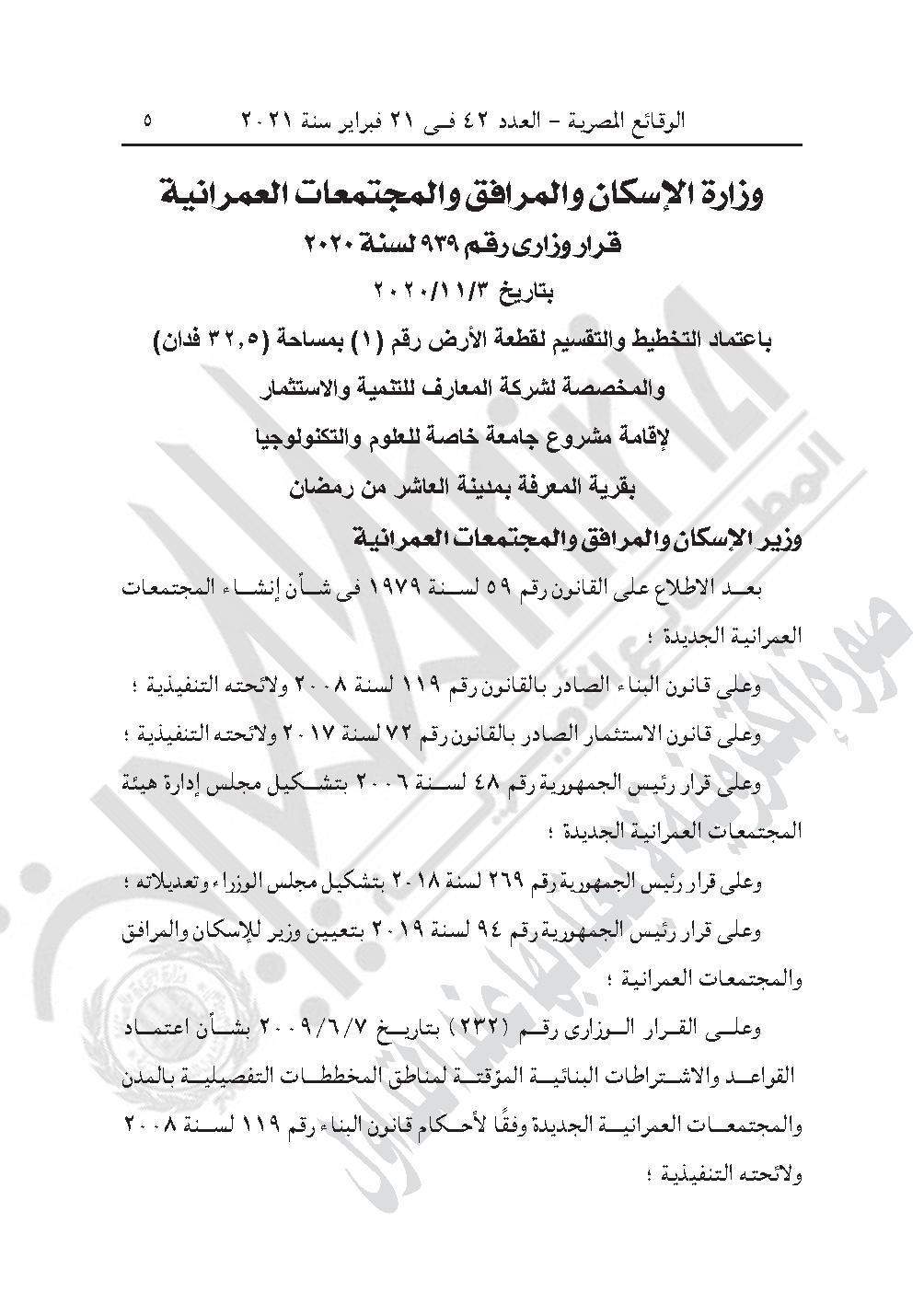 القرار رقم 939 لسنة 2020، باعتماد تخطيط وتقسيم قطعة الأرض رقم (1) بمساحة (32٫5 فدان) والمخصصة لشركة المعارف للتنمية والاستثمار لإقامة مشروع جامعة خاصة للعلوم والتكنولوجيا بقرية المعرفة بمدينة العاشر من رمضان، وذلك طبقًا للحدود الموضحة على الخريطة المرفقة بهذا القرار والعقد المبرم مع الشركة بتاريخ 25/8/2019، والتى تعتبر جميعها مكملة لهذا القرار.