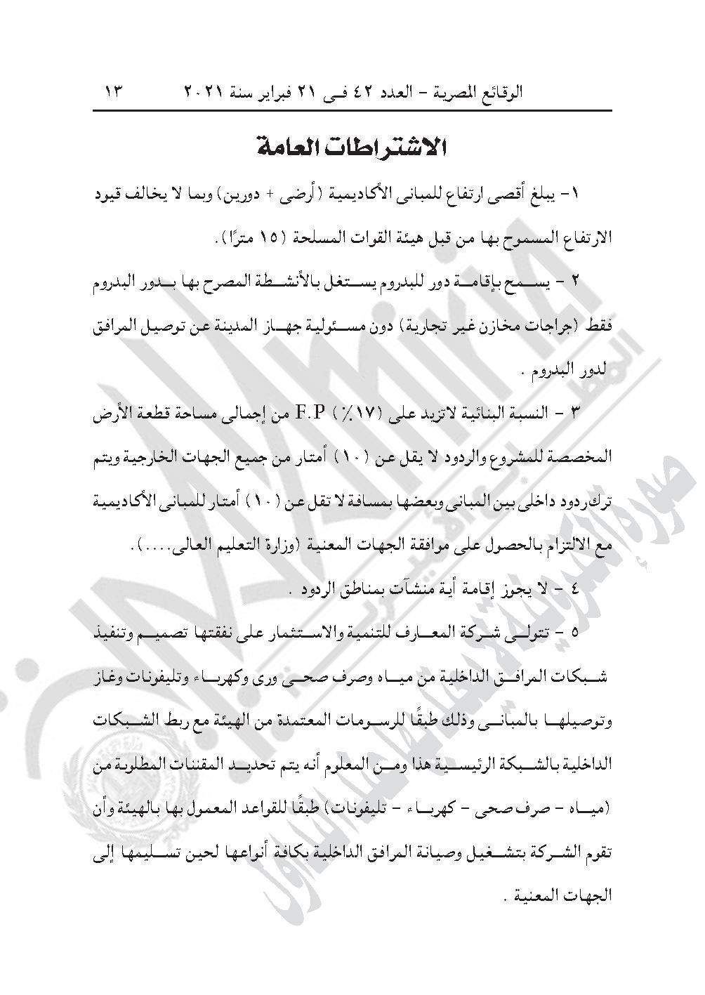 نشرت جريدة الوقائع المصرية في عددها رقم 42، الصادر في 21 فبراير 2021، قرارى وزارة الإسكان والمرافق والمجتمعات العمرانية باعتماد تخطيط وتقسيم قطعة الأرض، والمخصصة لشركة المعارف للتنمية والاستثمار لإقامة مشروع جامعة خاصة للعلوم والتكنولوجيا بقرية المعرفة بمدينة العاشر من رمضان، بتعديل قيد العقار رقم (10) ميدان الأوبرا بمجلد المبانى المتميزة.