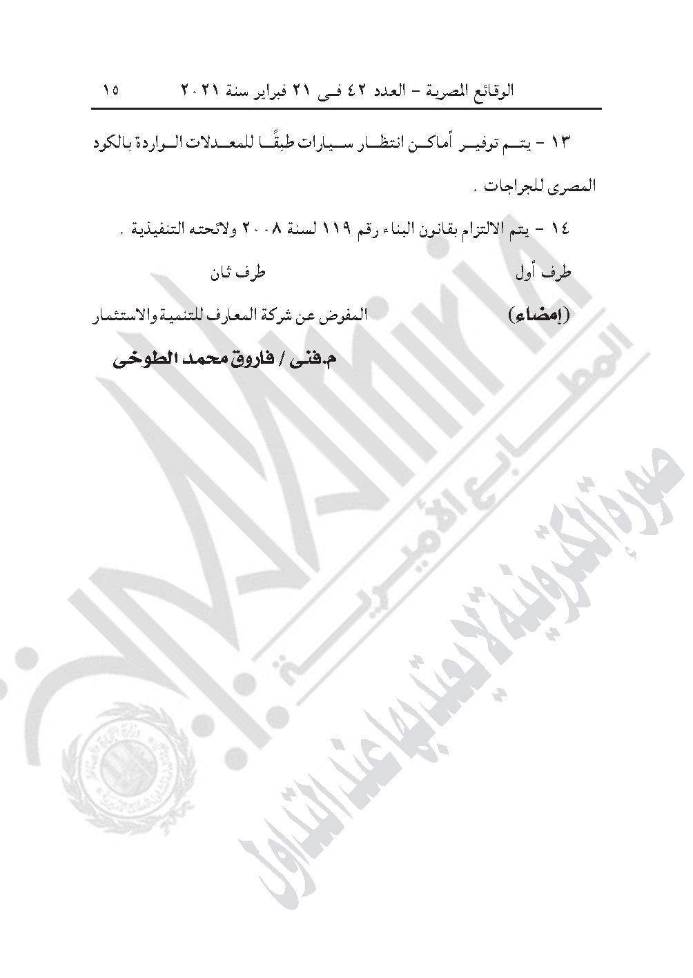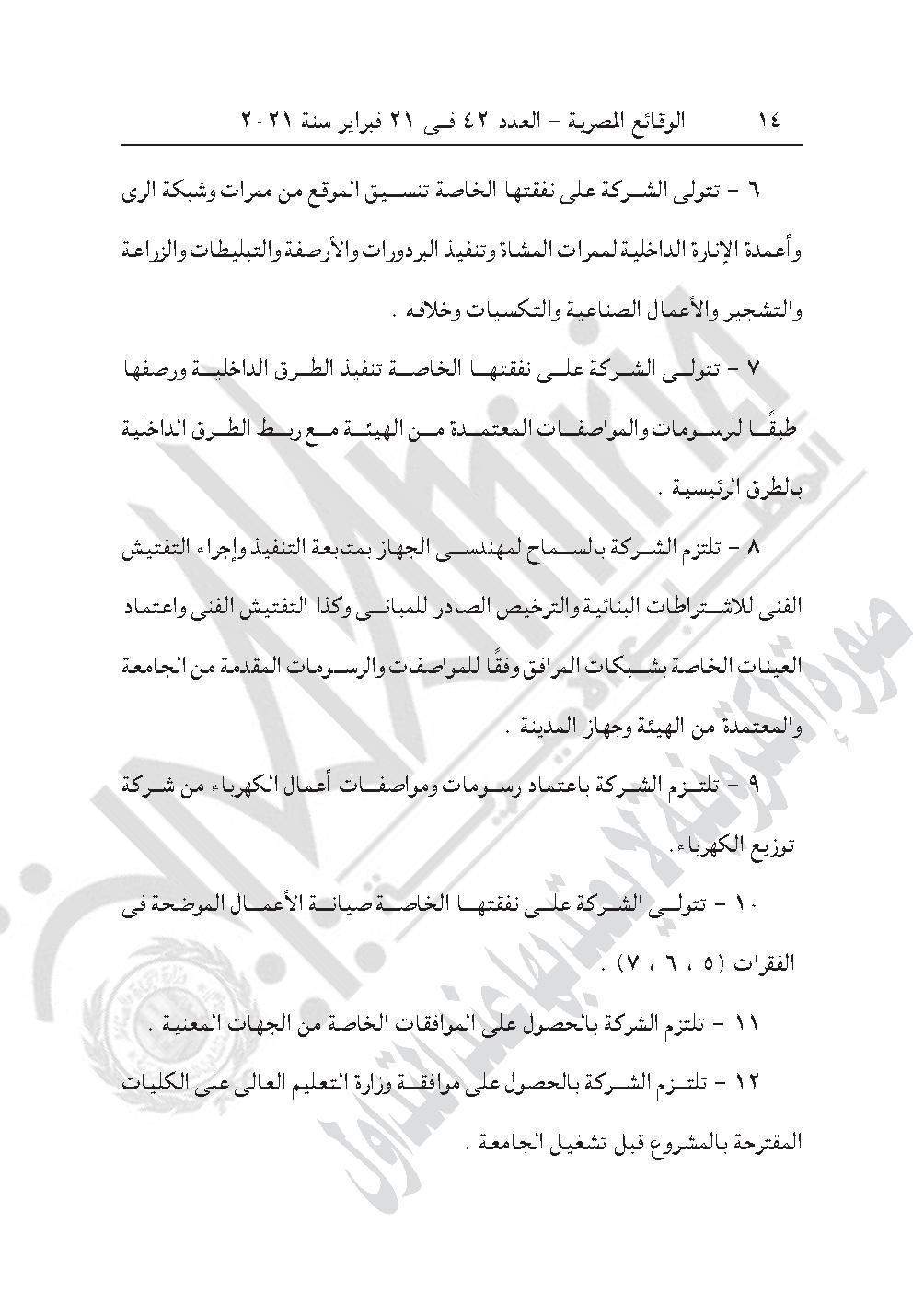 وتلتزم الشركة بالاشتراطات البنائية المعمول بها كحد أقصى وبشرط عدم تجاوز قيود الارتفاع المسموح بها من قبل وزارة الدفاع، كما تلتزم الشركة بتقديم الرسومات التنفيذية والمواصفات الفنية لأعمال شبكات المرافق فى إطار المخطط العام للمشروع والبرنامج الزمنى المعتمد لدراستها واعتمادها من الهيئة قبل البدء فى التنفيذ.