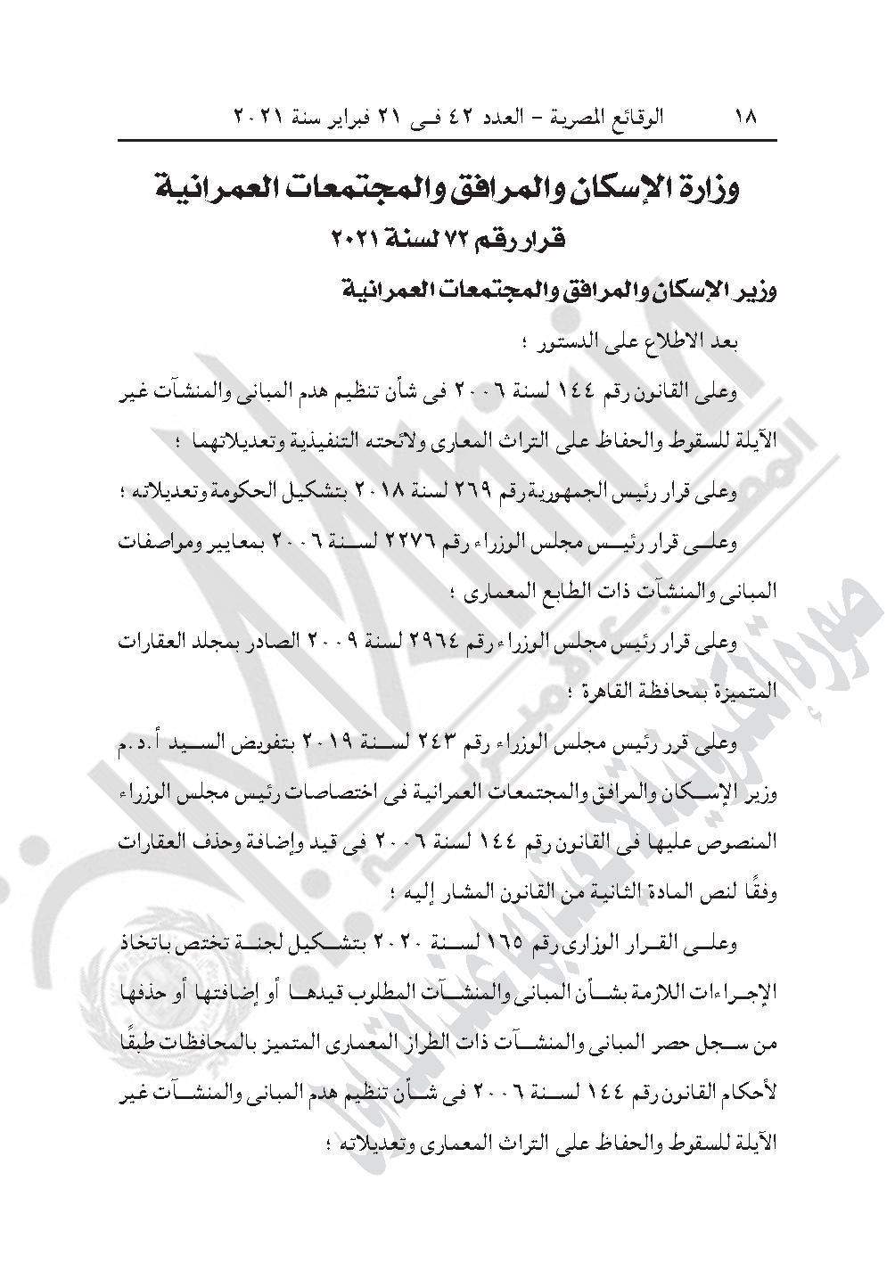 والقرار رقم 42 لسنة 2021، بتعديل قيد العقار رقم (10) ميدان الأوبرا - (يحمل 2 شارع 26 يوليو ويحمل 1 شارع عدلى) عابدين برقم توثيق (03190000304) بمجلد المبانى المتميزة الصادر به قرار رئيس مجلس الوزراء رقم 2964 لسنة 2009 بالاكتفاء بقيد "الواجهة المطلة على شارع عدلى فقط لفندق الكونتننتال الكائن 10 ميدان الأوبرا ويحمل (1) ش عدلى – عابدين" دون بقية العقار بذات رقم التوثيق.