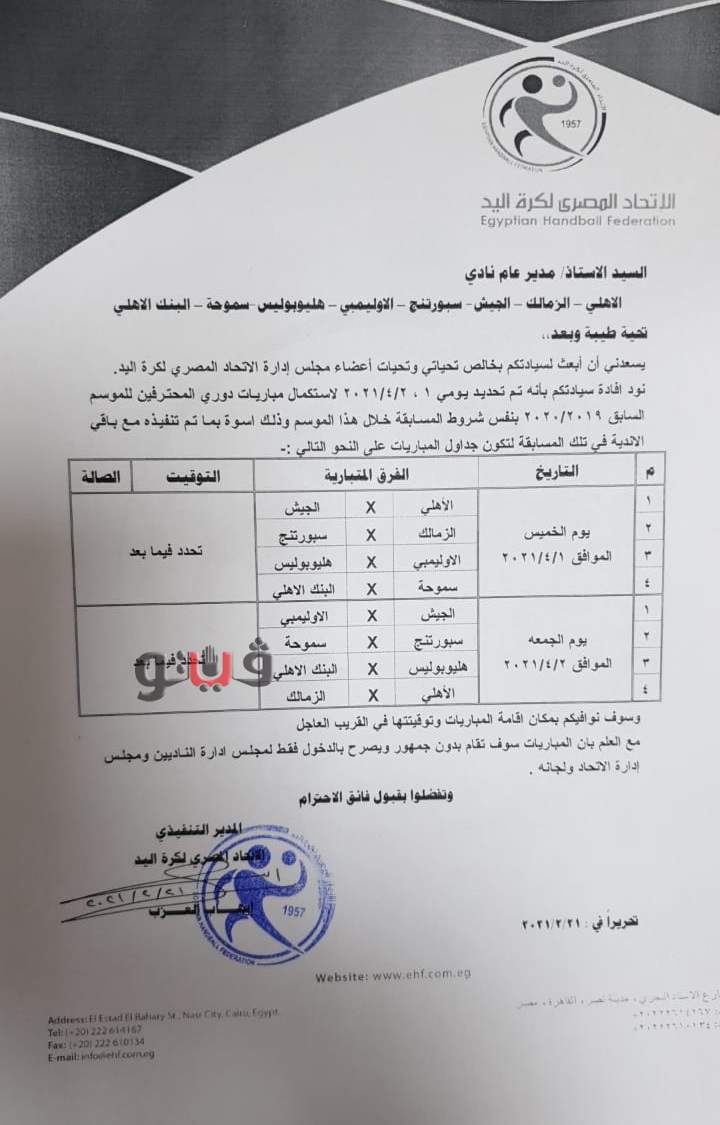 حدد مسئولو اتحاد كرة اليد برئاسة هشام نصر يومي 1 و2 أبريل المقبل، لاستكمال ما تبقى من مباريات الدوري للموسم الماضي 2019/2020.