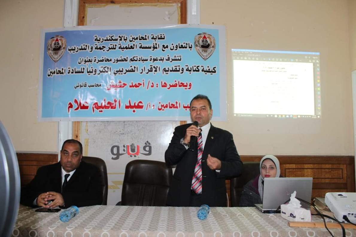 وأقيمت المحاضرة بعنوان "كتابة وتقديم الإقرار الضريبي إلكترونيا" بمقر معهد المحاماة بمحطة الرمل، حاضر فيها الدكتور أحمد حشيش الخبير القانوني بالضرائب، بحضور عدد من أعضاء مجلس نقابة المحامين وعدد كبير من محامو المدينة، وبثت مباشرة على صفحه النقابة.